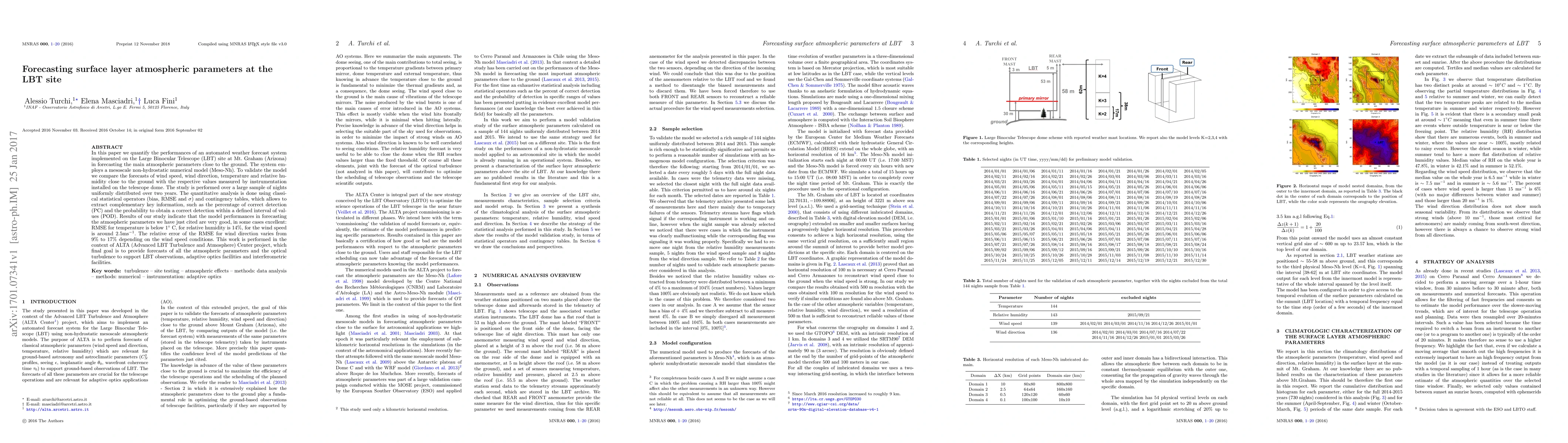 This paper evaluates an automated weather forecast system at the LBT site on Mt. Graham using a mesoscale model to predict wind speed, wind direction, temperature, and relative humidity. The model's performance is validated against on-site measurements, showing very good to excellent results, particularly with RMSE values below 1°C for temperature and around 2.5m/s for wind speed.