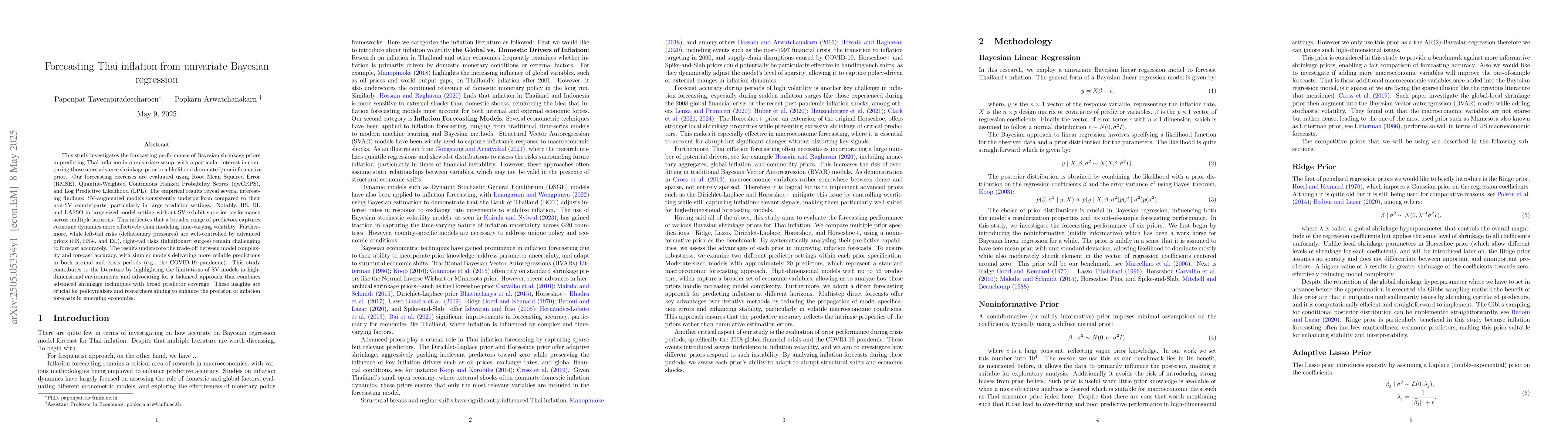 This study investigates the forecasting performance of Bayesian shrinkage priors in predicting Thai inflation in a univariate setup, with a particular interest in comparing those more advance shrinkage prior to a likelihood dominated/noninformative prior. Our forecasting exercises are evaluated using Root Mean Squared Error (RMSE), Quantile-Weighted Continuous Ranked Probability Scores (qwCRPS), and Log Predictive Likelihood (LPL). The empirical results reveal several interesting findings: SV-augmented models consistently underperform compared to their non-SV counterparts, particularly in large predictor settings. Notably, HS, DL and LASSO in large-sized model setting without SV exhibit superior performance across multiple horizons. This indicates that a broader range of predictors captures economic dynamics more effectively than modeling time-varying volatility. Furthermore, while left-tail risks (deflationary pressures) are well-controlled by advanced priors (HS, HS+, and DL), right-tail risks (inflationary surges) remain challenging to forecast accurately. The results underscore the trade-off between model complexity and forecast accuracy, with simpler models delivering more reliable predictions in both normal and crisis periods (e.g., the COVID-19 pandemic). This study contributes to the literature by highlighting the limitations of SV models in high-dimensional environments and advocating for a balanced approach that combines advanced shrinkage techniques with broad predictor coverage. These insights are crucial for policymakers and researchers aiming to enhance the precision of inflation forecasts in emerging economies.