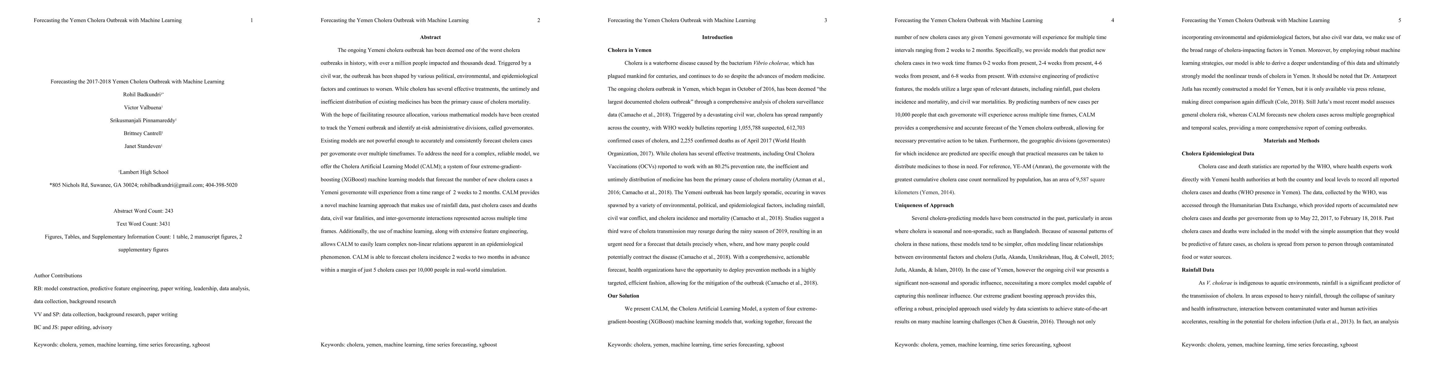 The ongoing Yemen cholera outbreak has been deemed one of the worst cholera outbreaks in history, with over a million people impacted and thousands dead. Triggered by a civil war, the outbreak has been shaped by various political, environmental, and epidemiological factors and continues to worsen. While cholera has several effective treatments, the untimely and inefficient distribution of existing medicines has been the primary cause of cholera mortality. With the hope of facilitating resource allocation, various mathematical models have been created to track the Yemeni outbreak and identify at-risk administrative divisions, called governorates. Existing models are not powerful enough to accurately and consistently forecast cholera cases per governorate over multiple timeframes. To address the need for a complex, reliable model, we offer the Cholera Artificial Learning Model (CALM); a system of 4 extreme-gradient-boosting (XGBoost) machine learning models that forecast the number of new cholera cases a Yemeni governorate will experience from a time range of 2 weeks to 2 months. CALM provides a novel machine learning approach that makes use of rainfall data, past cholera cases and deaths data, civil war fatalities, and inter-governorate interactions represented across multiple time frames. Additionally, the use of machine learning, along with extensive feature engineering, allows CALM to easily learn complex non-linear relations apparent in an epidemiological phenomenon. CALM is able to forecast cholera incidence 2 weeks to 2 months in advance within a margin of just 5 cholera cases per 10,000 people in real-world simulation.