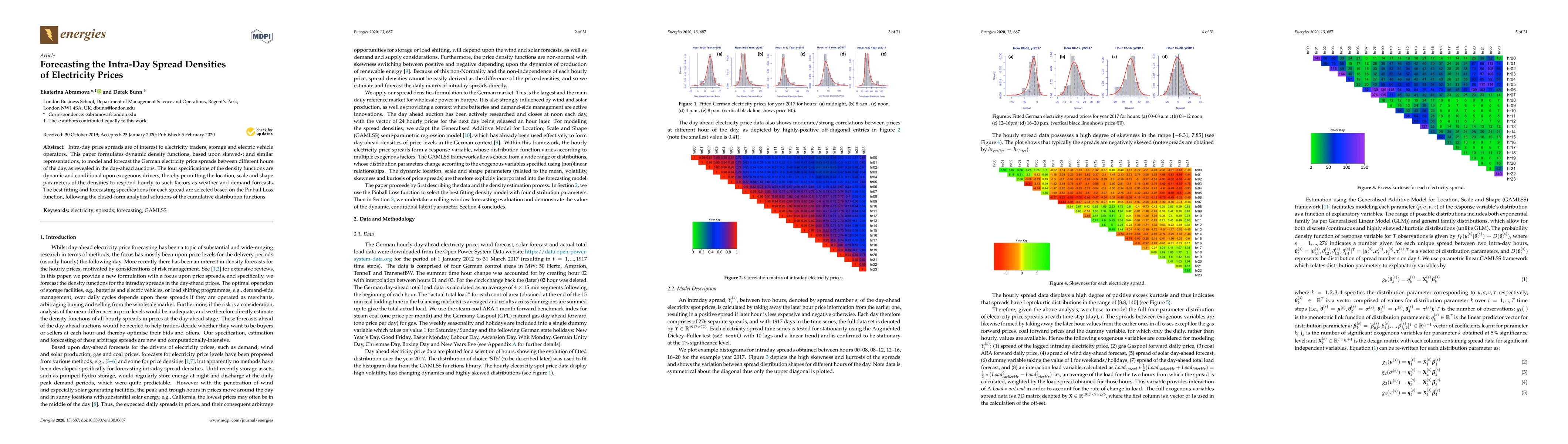 Intra-day price spreads are of interest to electricity traders, storage and electric vehicle operators. This paper formulates dynamic density functions, based upon skewed-t and similar representations, to model and forecast the German electricity price spreads between different hours of the day, as revealed in the day-ahead auctions. The four specifications of the density functions are dynamic and conditional upon exogenous drivers, thereby permitting the location, scale and shape parameters of the densities to respond hourly to such factors as weather and demand forecasts. The best fitting and forecasting specifications for each spread are selected based on the Pinball Loss function, following the closed-form analytical solutions of the cumulative distribution functions.
