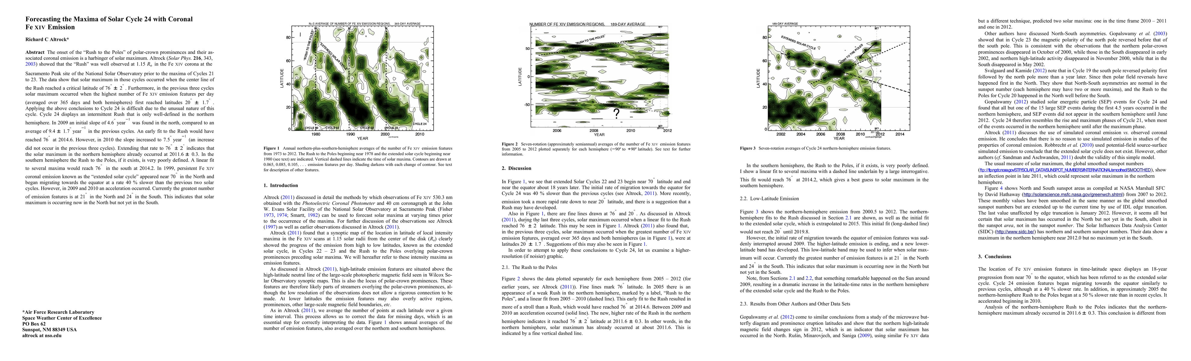 The onset of the "Rush to the Poles" of polar-crown prominences and their associated coronal emission is a harbinger of solar maximum. Altrock (Solar Phys. 216, 343, 2003) showed that the "Rush" was well-observed at 1.15 Ro in the Fe XIV corona at the Sacramento Peak site of the National Solar Observatory prior to the maxima of Cycles 21 to 23. The data show that solar maximum in those cycles occurred when the center line of the Rush reached a critical latitude of 76 +- 2{\deg}. Furthermore, in the previous three cycles solar maximum occurred when the highest number of Fe XIV emission features per day (averaged over 365 days and both hemispheres) first reached latitudes 20 +- 1.7{\deg}. Cycle 24 displays an intermittent Rush that is only well-defined in the northern hemisphere. In 2009 an initial slope of 4.6{\deg}/yr was found in the north, compared to an average of 9.4 +- 1.7 {\deg}/yr in the previous cycles. An early fit to the Rush would have reached 76{\deg} at 2014.6. However, in 2010 the slope increased to 7.5{\deg}/yr (an increase did not occur in the previous three cycles). Extending that rate to 76 +- 2{\deg} indicates that the solar maximum in the northern hemisphere already occurred at 2011.6 +- 0.3. In the southern hemisphere the Rush to the Poles, if it exists, is very poorly defined. A linear fit to several maxima would reach 76{\deg} in the south at 2014.2. In 1999, persistent Fe XIV coronal emission known as the "extended solar cycle" appeared near 70{\deg} in the north and began migrating towards the equator at a rate 40% slower than the previous two solar cycles. However, in 2009 and 2010 an acceleration occurred. Currently the greatest number of emission features is at 21{\deg} in the North and 24{\deg}in the South. This indicates that solar maximum is occurring now in the North but not yet in the South.