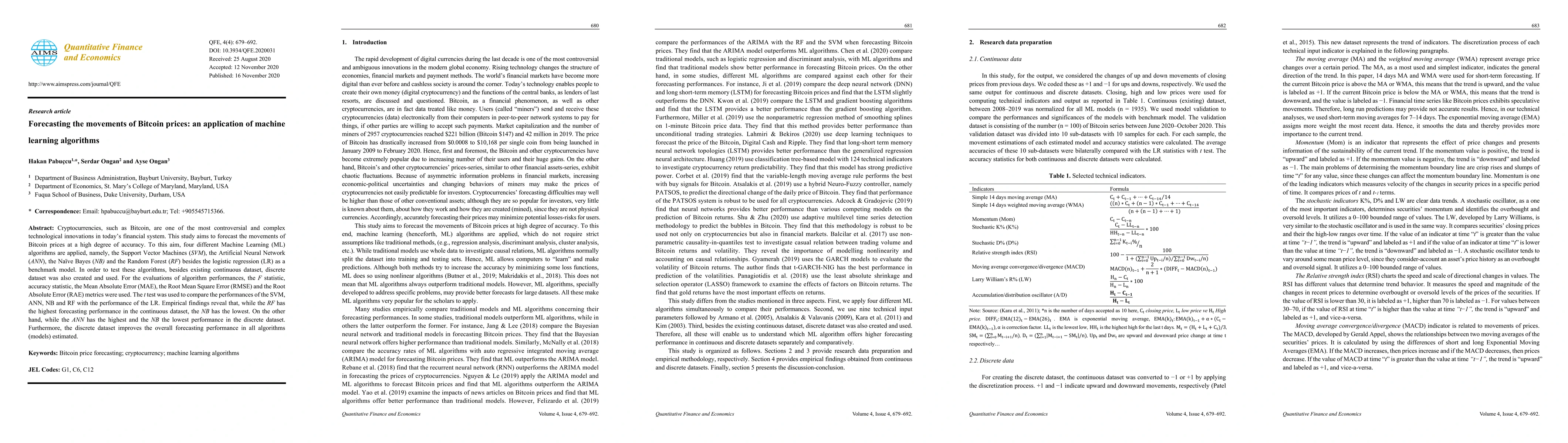 This study applies four machine learning algorithms—Support Vector Machines, Artificial Neural Network, Naive Bayes, and Random Forest—along with logistic regression to forecast Bitcoin price movements. The results show that Random Forest performs best on continuous data, while Artificial Neural Network excels on discrete data, indicating improved overall forecasting performance with the latter dataset.