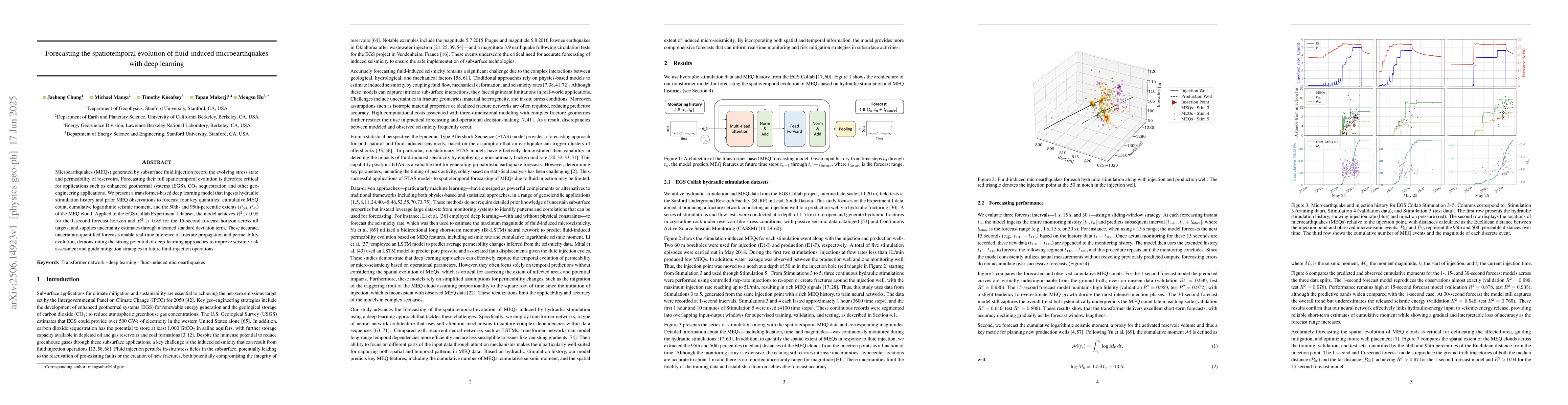 Microearthquakes (MEQs) generated by subsurface fluid injection record the evolving stress state and permeability of reservoirs. Forecasting their full spatiotemporal evolution is therefore critical for applications such as enhanced geothermal systems (EGS), CO$_2$ sequestration and other geo-engineering applications. We present a transformer-based deep learning model that ingests hydraulic stimulation history and prior MEQ observations to forecast four key quantities: cumulative MEQ count, cumulative logarithmic seismic moment, and the 50th- and 95th-percentile extents ($P_{50}, P_{95}$) of the MEQ cloud. Applied to the EGS Collab Experiment 1 dataset, the model achieves $R^2 >0.98$ for the 1-second forecast horizon and $R^2 >0.88$ for the 15-second forecast horizon across all targets, and supplies uncertainty estimates through a learned standard deviation term. These accurate, uncertainty-quantified forecasts enable real-time inference of fracture propagation and permeability evolution, demonstrating the strong potential of deep-learning approaches to improve seismic-risk assessment and guide mitigation strategies in future fluid-injection operations.
