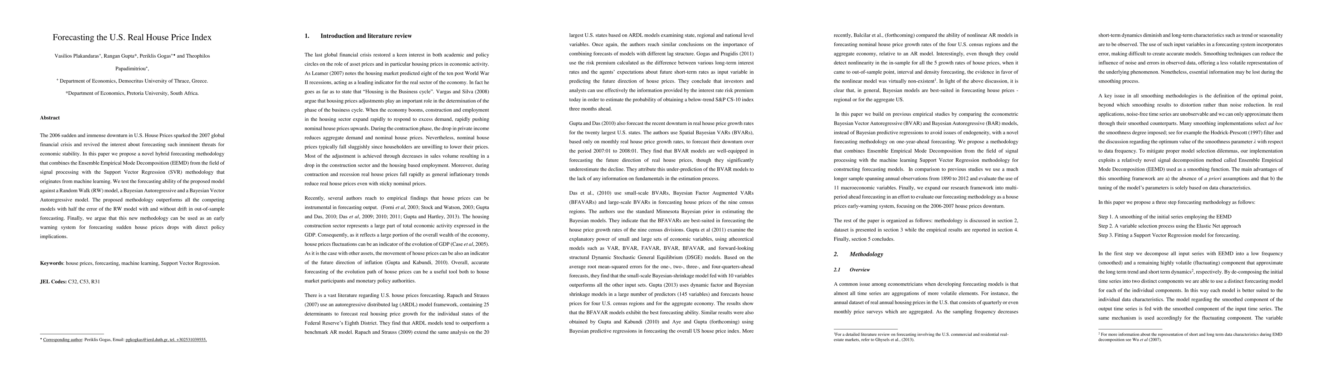 This paper proposes a hybrid forecasting model combining Ensemble Empirical Mode Decomposition (EEMD) and Support Vector Regression (SVR) to predict U.S. real house prices, outperforming traditional models like Random Walk and Bayesian Autoregressive models. The methodology can serve as an early warning system for sudden price drops, with significant policy implications.