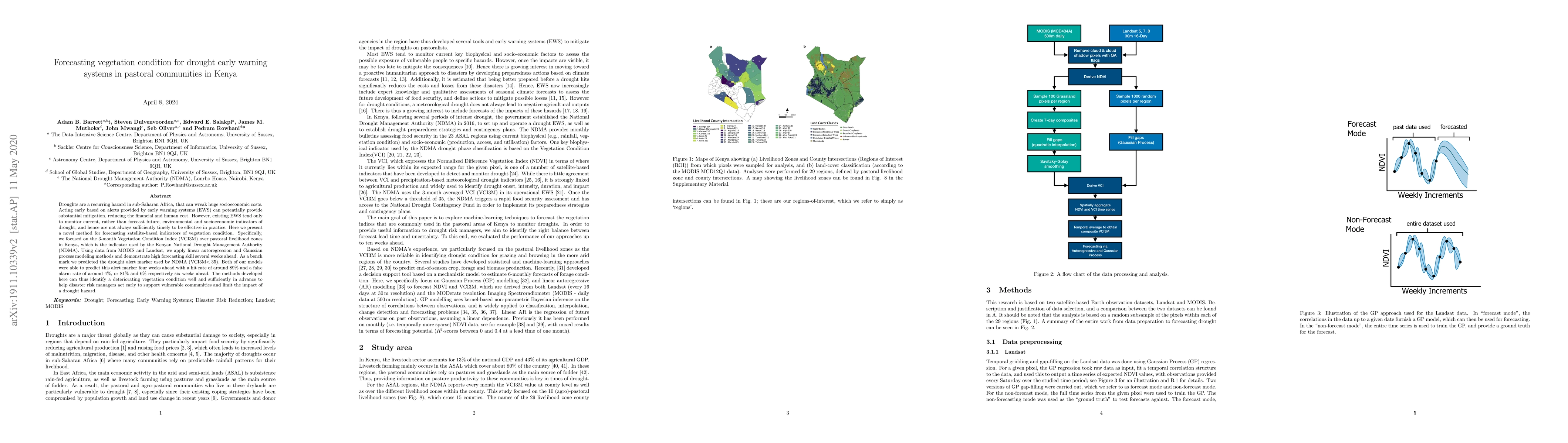 This paper introduces a novel method for forecasting vegetation conditions using satellite-based indicators, specifically the 3-month Vegetation Condition Index (VCI3M) in Kenya. The study employs linear autoregression and Gaussian process modeling to predict drought conditions several weeks ahead, achieving high accuracy and enabling early warning for pastoral communities.