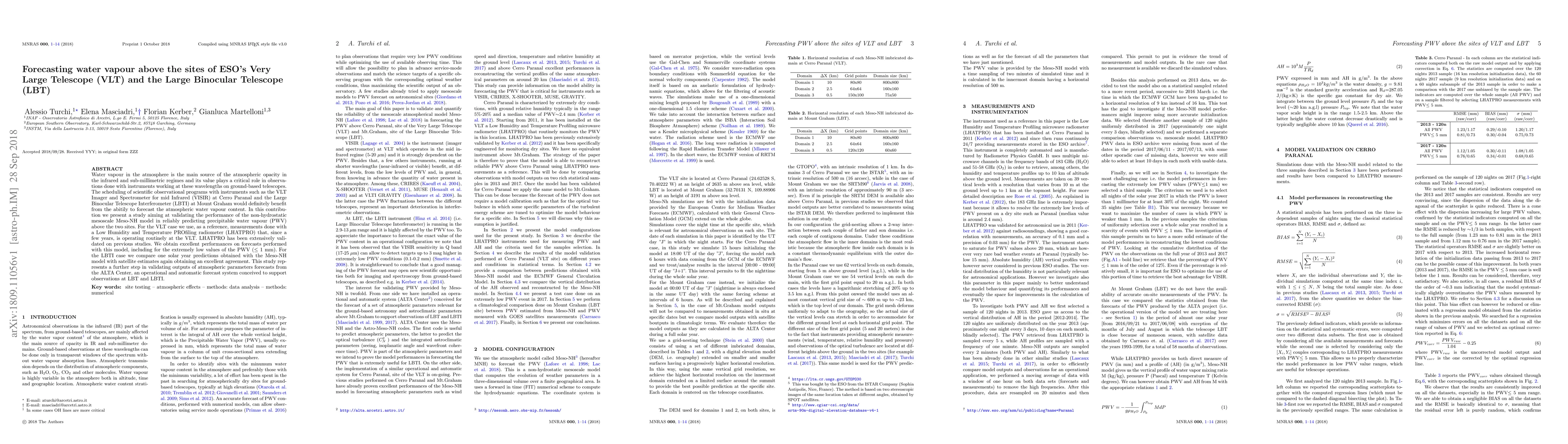 This paper validates the Meso-NH model's ability to forecast precipitable water vapour (PWV) above the VLT and LBT sites, showing excellent performance against radiometer and satellite measurements, respectively. This enhances the scheduling of infrared observations for these telescopes.
