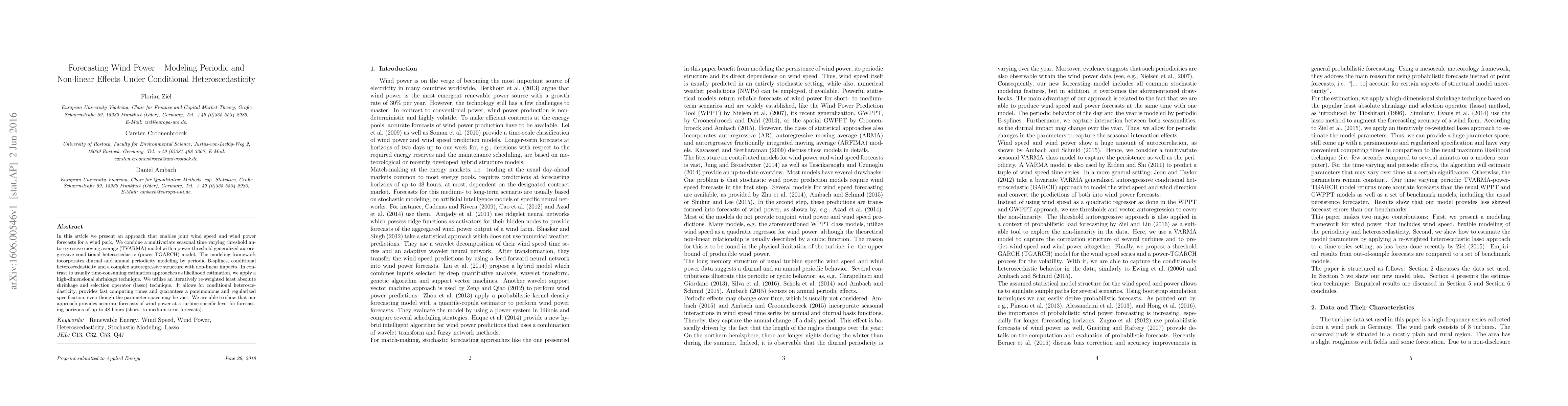 In this article we present an approach that enables joint wind speed and wind power forecasts for a wind park. We combine a multivariate seasonal time varying threshold autoregressive moving average (TVARMA) model with a power threshold generalized autoregressive conditional heteroscedastic (power-TGARCH) model. The modeling framework incorporates diurnal and annual periodicity modeling by periodic B-splines, conditional heteroscedasticity and a complex autoregressive structure with non-linear impacts. In contrast to usually time-consuming estimation approaches as likelihood estimation, we apply a high-dimensional shrinkage technique. We utilize an iteratively re-weighted least absolute shrinkage and selection operator (lasso) technique. It allows for conditional heteroscedasticity, provides fast computing times and guarantees a parsimonious and regularized specification, even though the parameter space may be vast. We are able to show that our approach provides accurate forecasts of wind power at a turbine-specific level for forecasting horizons of up to 48 h (short- to medium-term forecasts).
