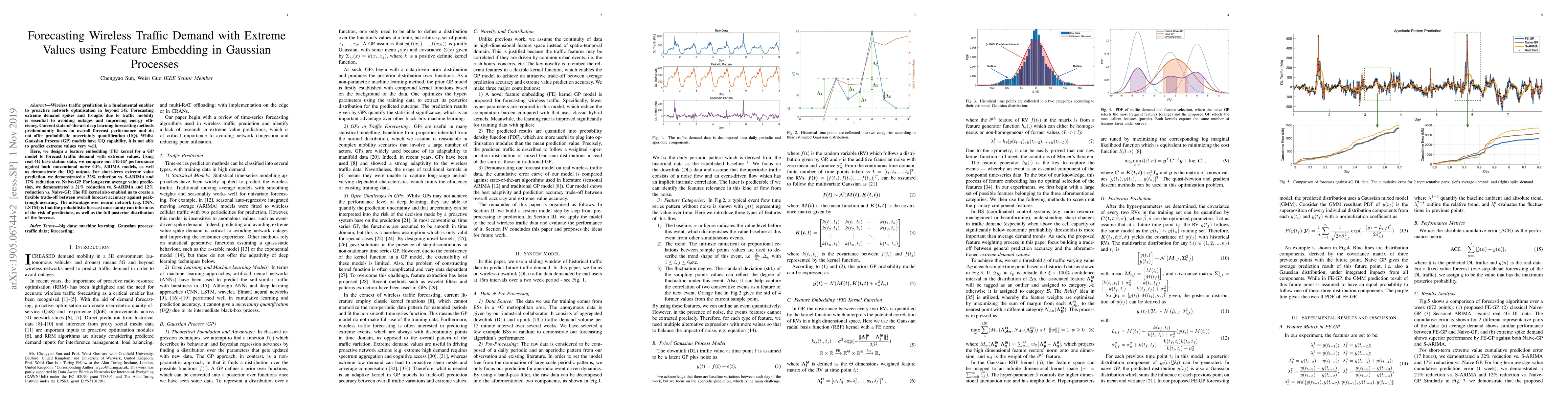 Researchers developed a feature embedding kernel for Gaussian Process models to forecast wireless demand with extreme values, achieving up to 32% reduction in short-term predictions and 21% reduction in long-term average value forecasts.
