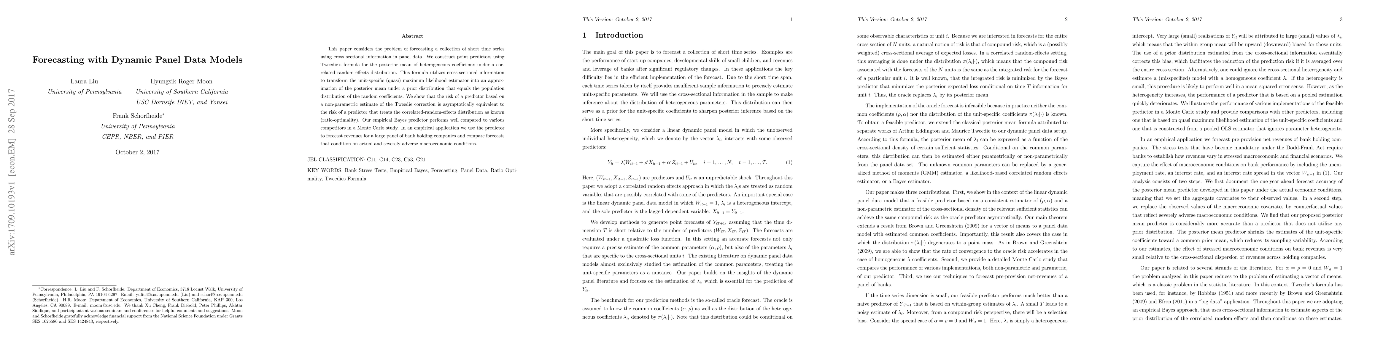 This paper develops dynamic panel data models for forecasting short time series using cross-sectional information, employing Tweedie's formula for posterior mean predictors. The empirical Bayes predictor shows competitive performance in Monte Carlo simulations and effectively forecasts bank revenues under varying macroeconomic conditions.