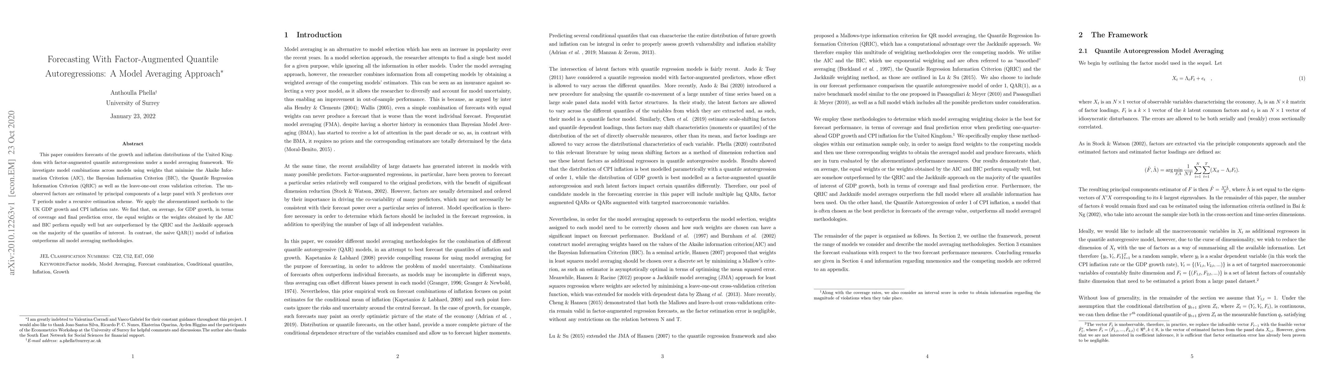 This paper proposes a model averaging approach for forecasting UK GDP growth and inflation using factor-augmented quantile autoregressions, finding that equal weights or AIC/BIC-based weights perform well for GDP growth, while the QRIC and Jackknife methods excel. For inflation, the simple QAR(1) model is most effective.