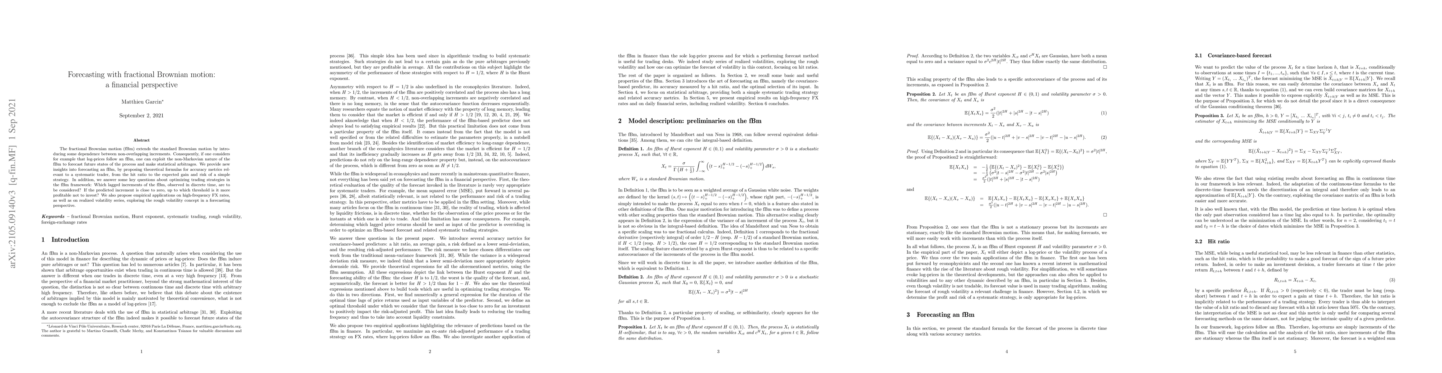 This paper explores the use of fractional Brownian motion (fBm) for financial forecasting, proposing theoretical formulas for accuracy metrics and strategies. It investigates optimal trading strategies within the fBm framework, including the selection of lagged increments and thresholds for investment decisions, and applies these methods to high-frequency FX rates and realized volatility series.
