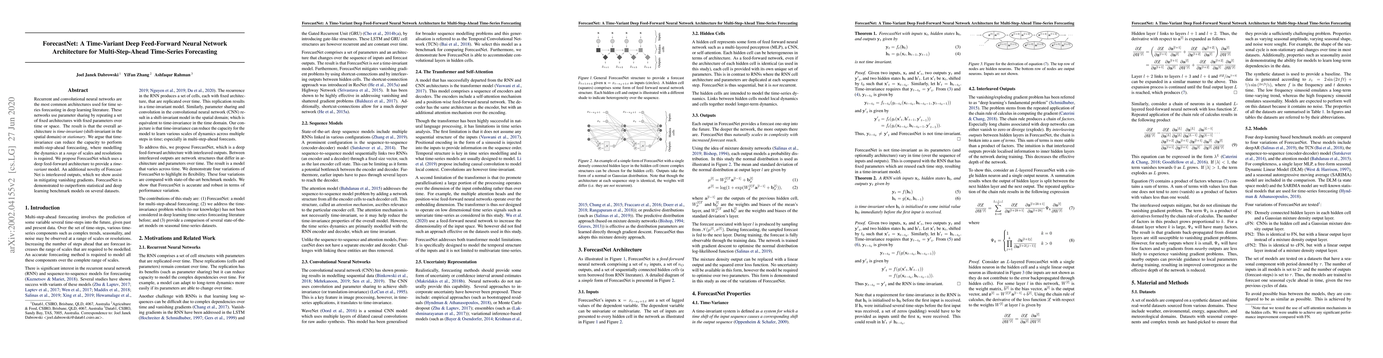 ForecastNet introduces a time-variant deep feed-forward neural network architecture for multi-step-ahead time-series forecasting, addressing the limitations of time-invariant models. It employs interleaved outputs to mitigate vanishing gradients and outperforms existing statistical and deep learning benchmarks on various datasets.
