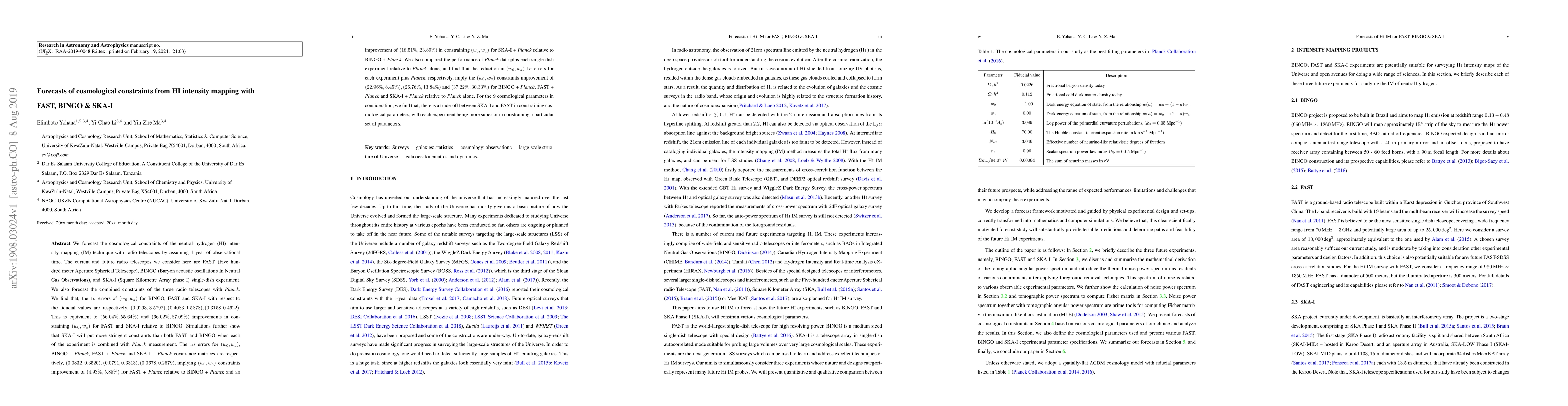 This paper forecasts the cosmological constraints from neutral hydrogen intensity mapping using FAST, BINGO, and SKA-I radio telescopes, predicting significant improvements in constraining dark energy parameters $(w_{0}, w_{a})$. SKA-I is expected to outperform both FAST and BINGO, especially when combined with Planck measurements.