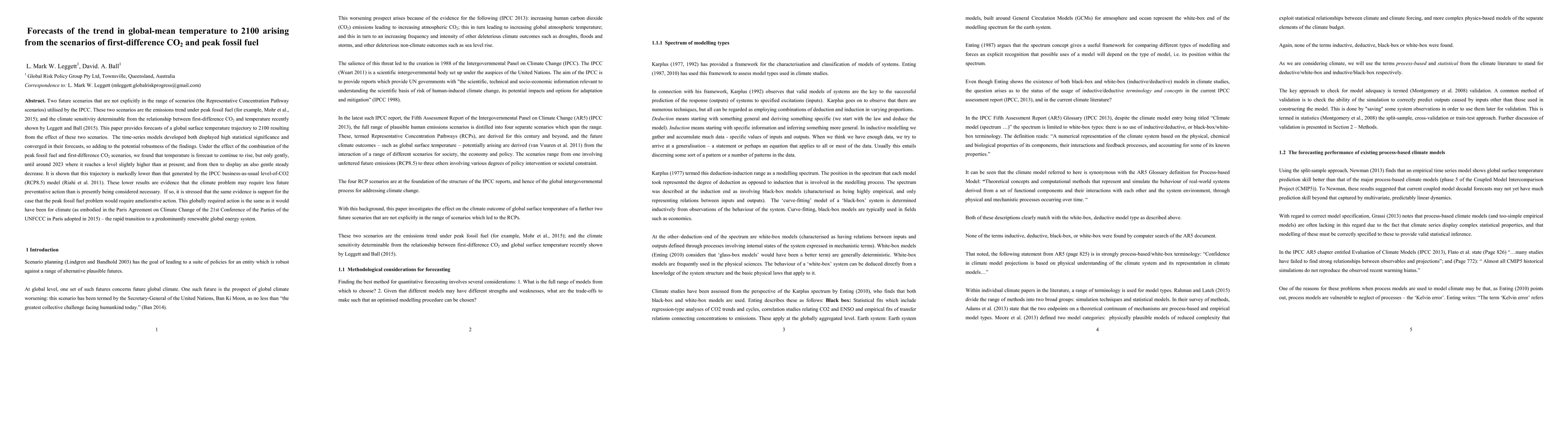 Two future scenarios that are not explicitly in the range of scenarios (the Representative Concentration Pathway scenarios) utilised by the IPCC. These two scenarios are the emissions trend under peak fossil fuel (for example, Mohr et al., 2015); and the climate sensitivity determinable from the relationship between first-difference CO2 and temperature recently shown by Leggett and Ball (2015). This paper provides forecasts of a global surface temperature trajectory to 2100 resulting from the effect of these two scenarios. The time-series models developed both displayed high statistical significance and converged in their forecasts, so adding to the potential robustness of the findings. Under the effect of the combination of the peak fossil fuel and first-difference CO2 scenarios, we found that temperature is forecast to continue to rise, but only gently, until around 2023 where it reaches a level slightly higher than at present; and from then to display an also gentle steady decrease. It is shown that this trajectory is markedly lower than that generated by the IPCC business-as-usual level-of-CO2 (RCP8.5) model (Riahi et al. 2011). These lower results are evidence that the climate problem may require less future preventative action than is presently being considered necessary. If so, it is stressed that the same evidence is support for the case that the peak fossil fuel problem would require ameliorative action. This globally required action is the same as it would have been for climate (as embodied in the Paris Agreement on Climate Change of the 21st Conference of the Parties of the UNFCCC in Paris adopted in 2015): the rapid transition to a predominantly renewable global energy system.