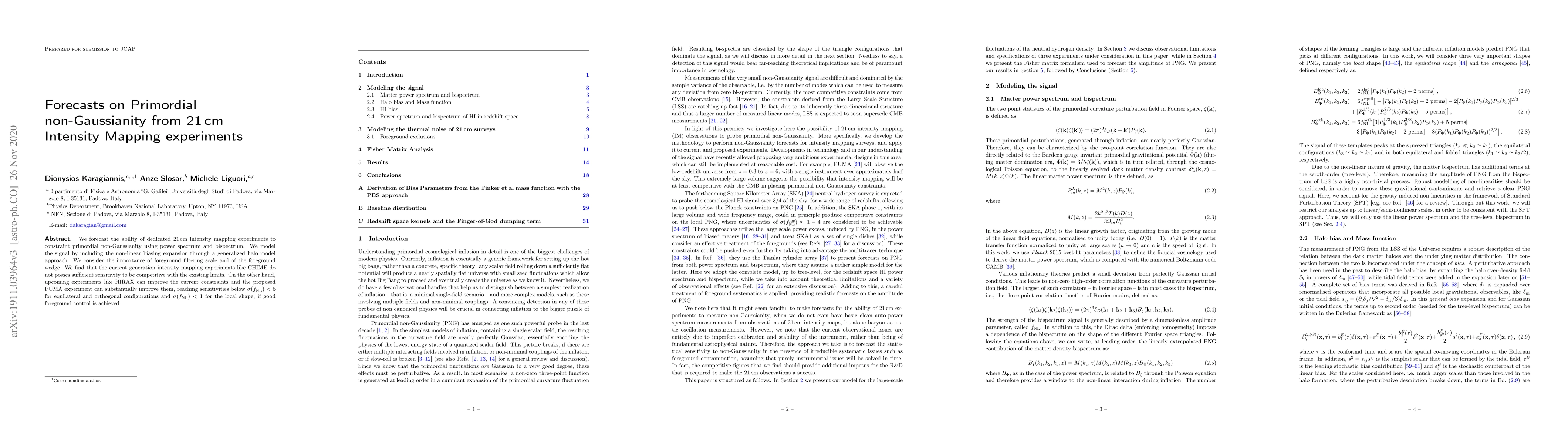 We forecast ability of dedicated 21 cm intensity mapping experiments to constraint primordial non-Gaussianity using power spectrum and bispectrum. We model the signal including the non-linear biasing expansion using a generalized halo model approach. We consider the importance of foreground filtering scale and of the foreground wedge. We find that the current generation intensity mapping experiments like CHIME do not posses sufficient sensitivity to be competitive with the existing limits. On the other hand, upcoming experiments like HIRAX can improve the current constraints and the proposed PUMA experiment can substantially improve them, reaching sensitivities below $\sigma (f_{\rm NL})<5$ for equilateral and orthogonal configurations and $\sigma( f_{\rm NL}) < 1$ for the local shape if good foreground control is achieved.