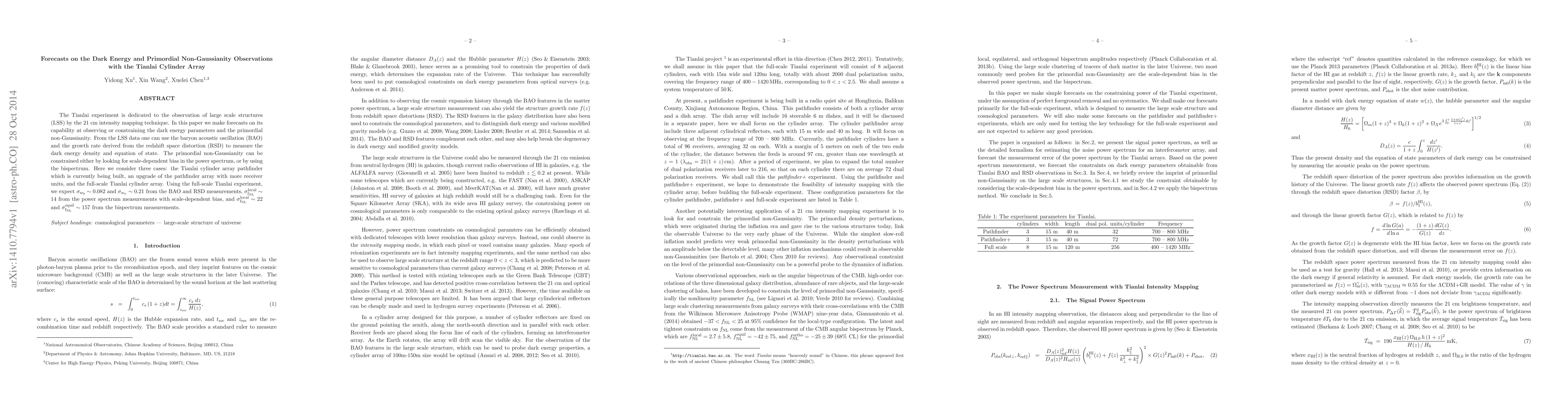 The Tianlai experiment aims to observe large scale structures using the 21 cm intensity mapping technique. Forecasts indicate it can constrain dark energy parameters and primordial non-Gaussianity, achieving $\sigma_{w_0} \sim 0.082$ and $\sigma_{w_a} \sim 0.21$ from baryon acoustic oscillations and redshift space distortion, and $\sigma_{\rm f_{NL}}^{\rm local} \sim 14$ from power spectrum measurements.