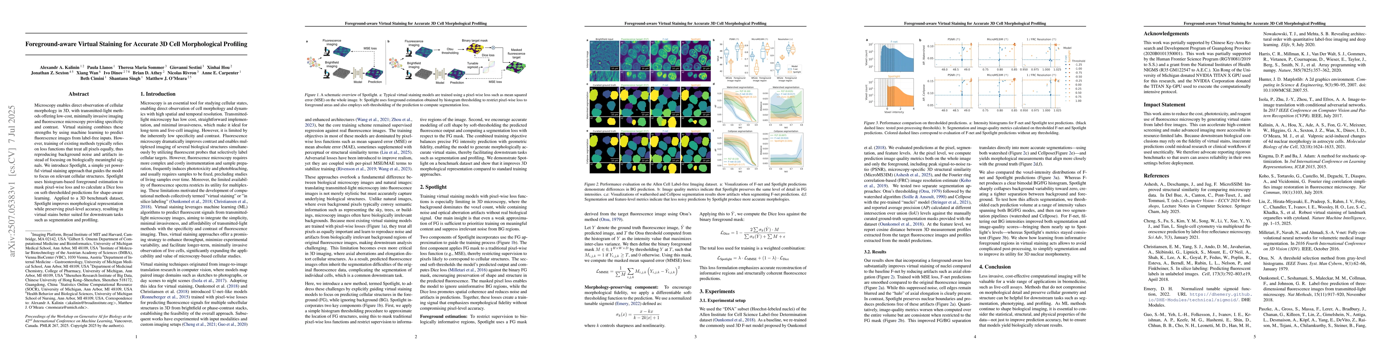 Microscopy enables direct observation of cellular morphology in 3D, with transmitted-light methods offering low-cost, minimally invasive imaging and fluorescence microscopy providing specificity and contrast. Virtual staining combines these strengths by using machine learning to predict fluorescence images from label-free inputs. However, training of existing methods typically relies on loss functions that treat all pixels equally, thus reproducing background noise and artifacts instead of focusing on biologically meaningful signals. We introduce Spotlight, a simple yet powerful virtual staining approach that guides the model to focus on relevant cellular structures. Spotlight uses histogram-based foreground estimation to mask pixel-wise loss and to calculate a Dice loss on soft-thresholded predictions for shape-aware learning. Applied to a 3D benchmark dataset, Spotlight improves morphological representation while preserving pixel-level accuracy, resulting in virtual stains better suited for downstream tasks such as segmentation and profiling.