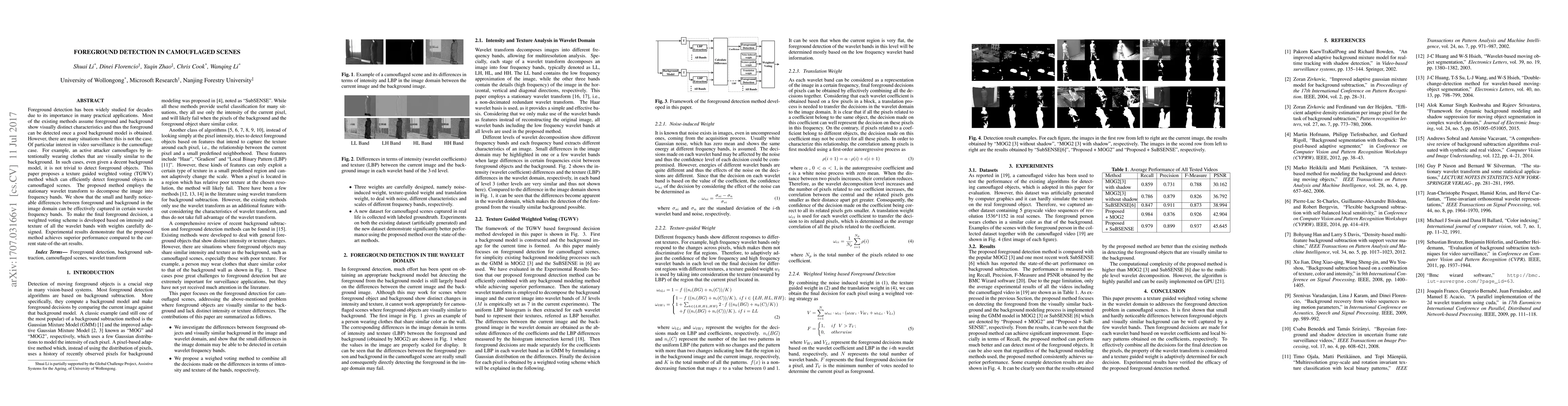 Foreground detection has been widely studied for decades due to its importance in many practical applications. Most of the existing methods assume foreground and background show visually distinct characteristics and thus the foreground can be detected once a good background model is obtained. However, there are many situations where this is not the case. Of particular interest in video surveillance is the camouflage case. For example, an active attacker camouflages by intentionally wearing clothes that are visually similar to the background. In such cases, even given a decent background model, it is not trivial to detect foreground objects. This paper proposes a texture guided weighted voting (TGWV) method which can efficiently detect foreground objects in camouflaged scenes. The proposed method employs the stationary wavelet transform to decompose the image into frequency bands. We show that the small and hardly noticeable differences between foreground and background in the image domain can be effectively captured in certain wavelet frequency bands. To make the final foreground decision, a weighted voting scheme is developed based on intensity and texture of all the wavelet bands with weights carefully designed. Experimental results demonstrate that the proposed method achieves superior performance compared to the current state-of-the-art results.