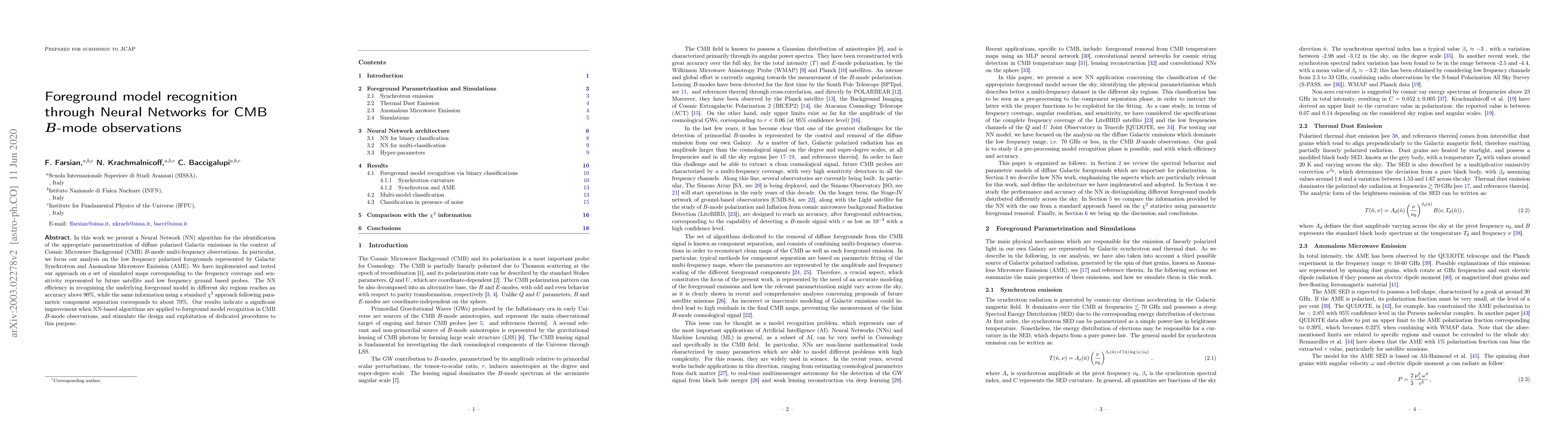 This paper introduces a Neural Network algorithm for identifying the parametrization of polarized Galactic emissions in CMB $B$-mode observations, achieving about $90\%$ accuracy. It compares the NN's performance with traditional parametric methods, demonstrating a significant improvement in foreground model recognition for future satellite and ground-based probes.