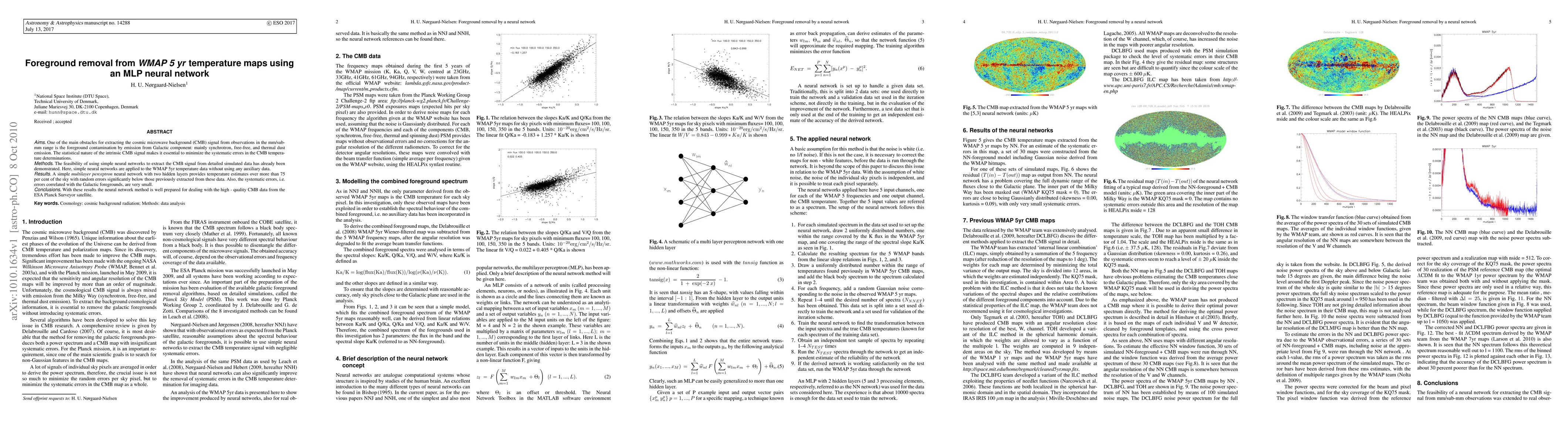 The paper presents a novel application of multilayer perceptron neural networks for foreground removal in WMAP 5-year temperature maps, significantly improving CMB temperature estimation.