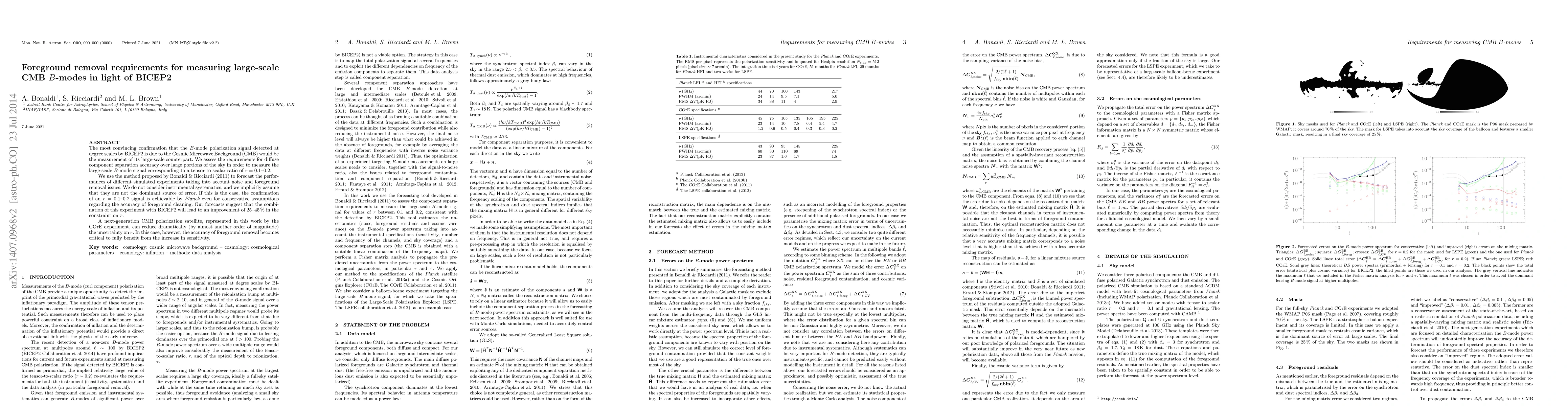 This paper assesses the requirements for accurate foreground removal to measure large-scale B-modes in the CMB, confirming BICEP2's detection. It forecasts that Planck can achieve a confirmation of a tensor-to-scalar ratio (r) of 0.1-0.2 with current techniques, while a next-generation satellite like COrE could significantly improve this constraint, emphasizing the critical role of foreground removal accuracy.