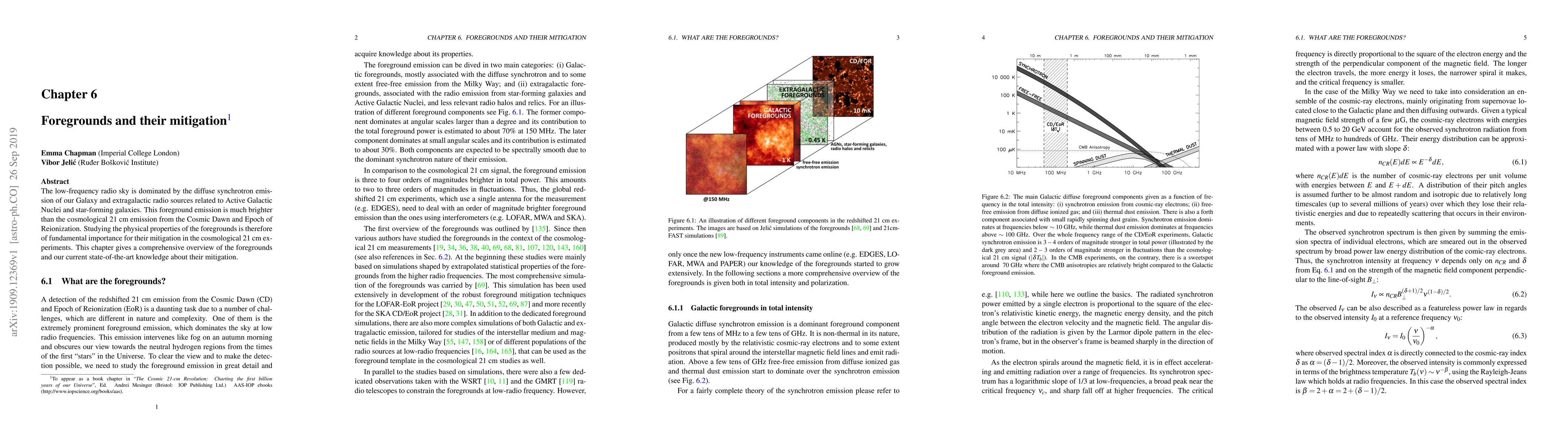 The paper discusses foreground emissions in the radio sky that overpower the cosmic 21 cm signal, highlighting their importance for mitigation in cosmological experiments. It provides an overview of current knowledge on foreground properties and mitigation strategies.