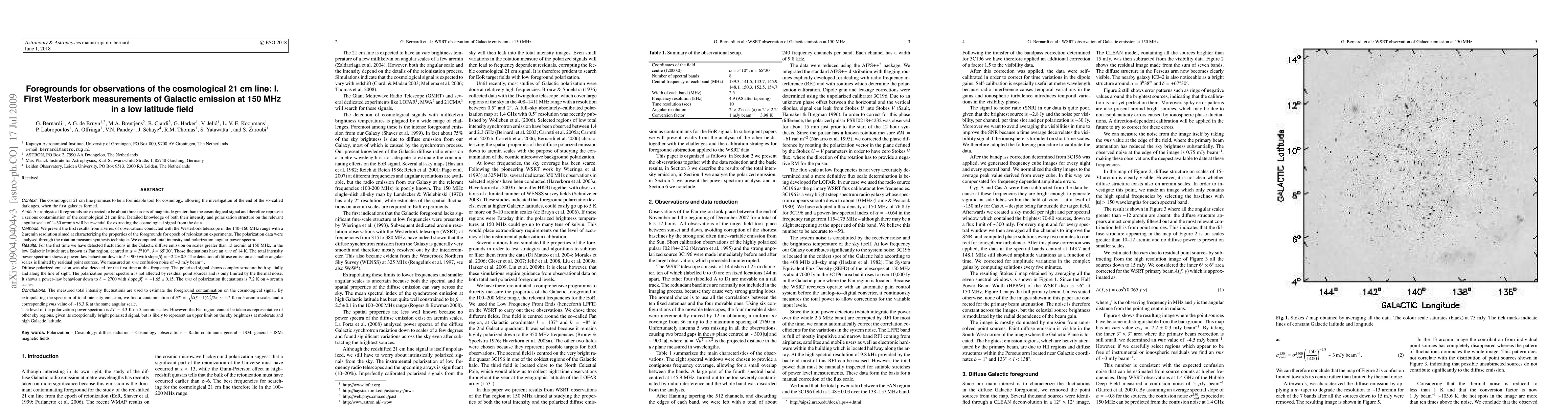 We present the first results from a series of observations conducted with the Westerbork telescope in the 140--160 MHz range with a 2 arcmin resolution aimed at characterizing the properties of the foregrounds for epoch of reionization experiments. For the first time we have detected fluctuations in the Galactic diffuse emission on scales greater than 13 arcmin at 150 MHz, in the low Galactic latitude area known as Fan region. Those fluctuations have an $rms$ of 14 K. The total intensity power spectrum shows a power--law behaviour down to $\ell \sim 900$ with slope $\beta^I_\ell = -2.2 \pm 0.3$. The detection of diffuse emission at smaller angular scales is limited by residual point sources. We measured an $rms$ confusion noise of $\sim$3 mJy beam$^{-1}$. Diffuse polarized emission was also detected for the first time at this frequency. The polarized signal shows complex structure both spatially and along the line of sight. The polarization power spectrum shows a power--law behaviour down to $\ell \sim 2700$ with slope $\beta^P_\ell = -1.65 \pm 0.15$. The $rms$ of polarization fluctuations is 7.2 K on 4 arcmin scales. By extrapolating the measured spectrum of total intensity emission, we find a contamination on the cosmological signal of $\delta T= \sqrt{\ell (\ell+1) C^I_\ell / 2\pi} \sim 5.7$ K on 5 arcmin scales and a corresponding $rms$ value of $\sim$18.3 K at the same angular scale. The level of the polarization power spectrum is $\delta T \sim 3.3$ K on 5 arcmin scales. Given its exceptionally bright polarized signal, the Fan region is likely to represent an upper limit on the sky brightness at moderate and high Galactic latitude.