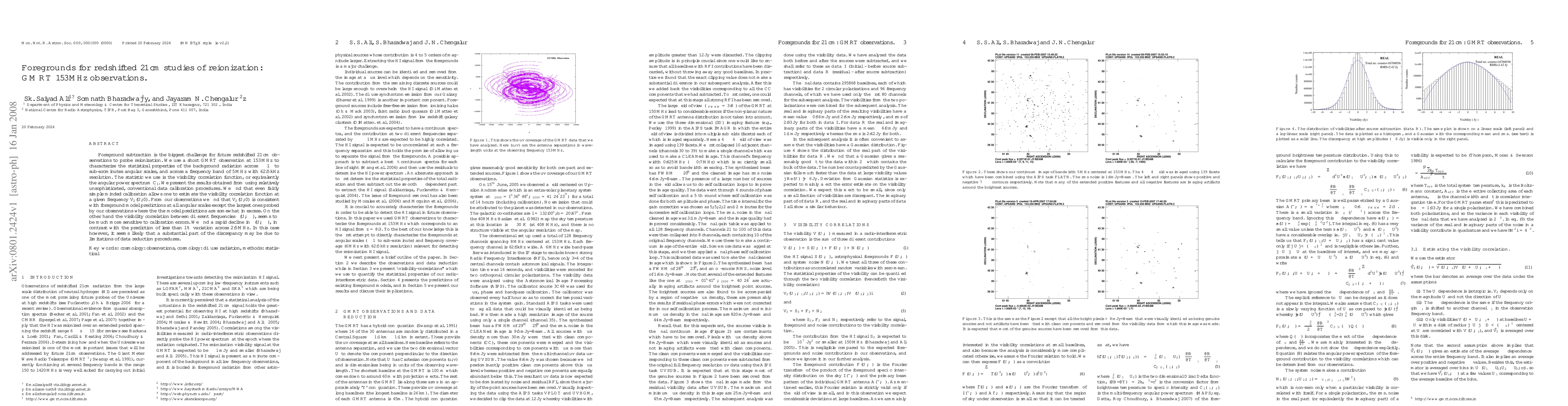 Foreground subtraction is the biggest challenge for future redshifted 21 cm observations to probe reionization. We use a short GMRT observation at 153 MHz to characterize the statistical properties of the background radiation across ~ one degree to sub-arcminutes angular scales, and across a frequency band of 5 MHz with 62.5 kHz resolution. The statistic we use is the visibility correlation function, or equivalently the angular power spectrum C_l. We present the results obtained from using relatively unsophisticated, conventional data calibration procedures. We find that even fairly simple minded calibration allows one to estimate the visibility correlation function at a given frequency V_2(U,0). From our observations we find that V_2(U,0) is consistent with foreground model predictions at all angular scales except the largest ones probed by our observations where the the model predictions are somewhat in excess. On the other hand the visibility correlation between different frequencies kappa(U, Delta nu), seems to be much more sensitive to calibration errors. We find a rapid decline in kappa(U, Delta nu), in contrast with the prediction of less than 1 % variation across 2.5 MHz. In this case however, it seems likely that a substantial part of the discrepancy may be due to limitations of data reduction procedures.