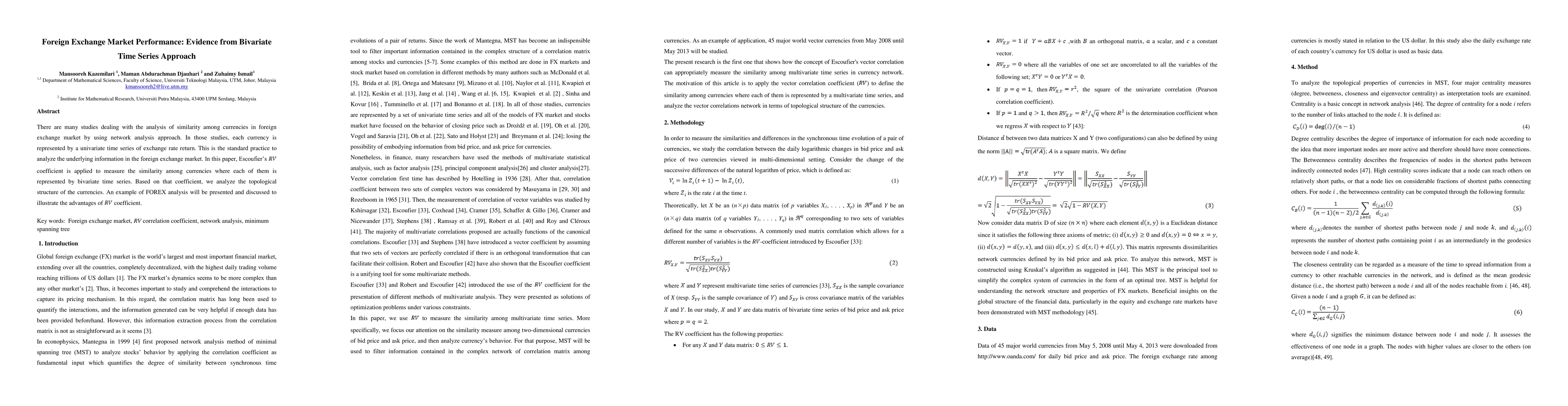 This paper employs Escoufier's RV coefficient to measure similarity among currencies in the foreign exchange market, using bivariate time series instead of univariate. The study reveals the topological structure of currency relationships, showcasing the advantages of this approach over traditional methods.