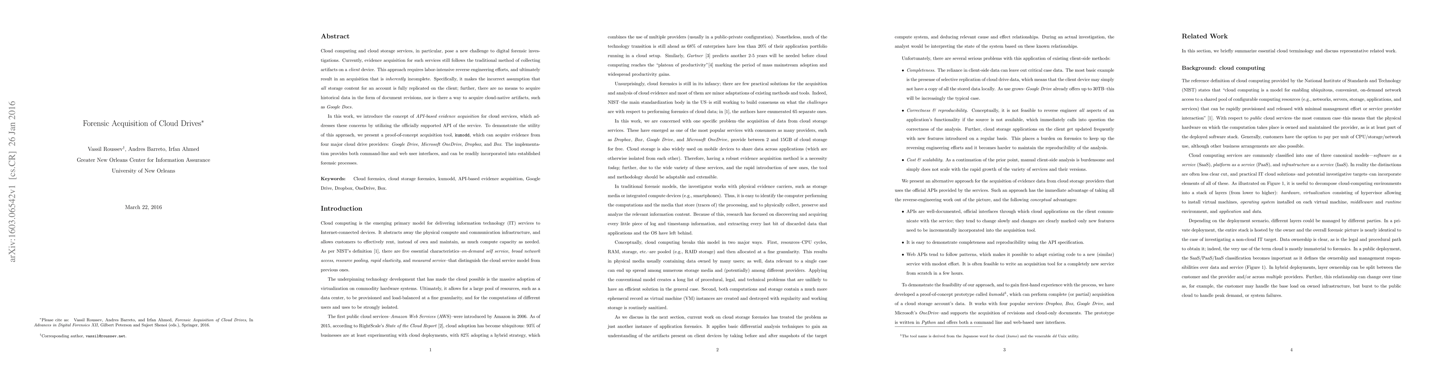 Cloud computing and cloud storage services, in particular, pose a new challenge to digital forensic investigations. Currently, evidence acquisition for such services still follows the traditional method of collecting artifacts on a client device. This approach requires labor-intensive reverse engineering efforts, and ultimately results in an acquisition that is inherently incomplete. Specifically, it makes the incorrect assumption that all storage content for an account is fully replicated on the client; further, there are no means to acquire historical data in the form of document revisions, nor is there a way to acquire cloud-native artifacts, such as Google Docs. In this work, we introduce the concept of API-based evidence acquisition for cloud services, which addresses these concerns by utilizing the officially supported API of the service. To demonstrate the utility of this approach, we present a proof-of-concept acquisition tool, kumodd, which can acquire evidence from four major cloud drive providers: Google Drive, Microsoft OneDrive, Dropbox, and Box. The implementation provides both command-line and web user interfaces, and can be readily incorporated into established forensic processes.