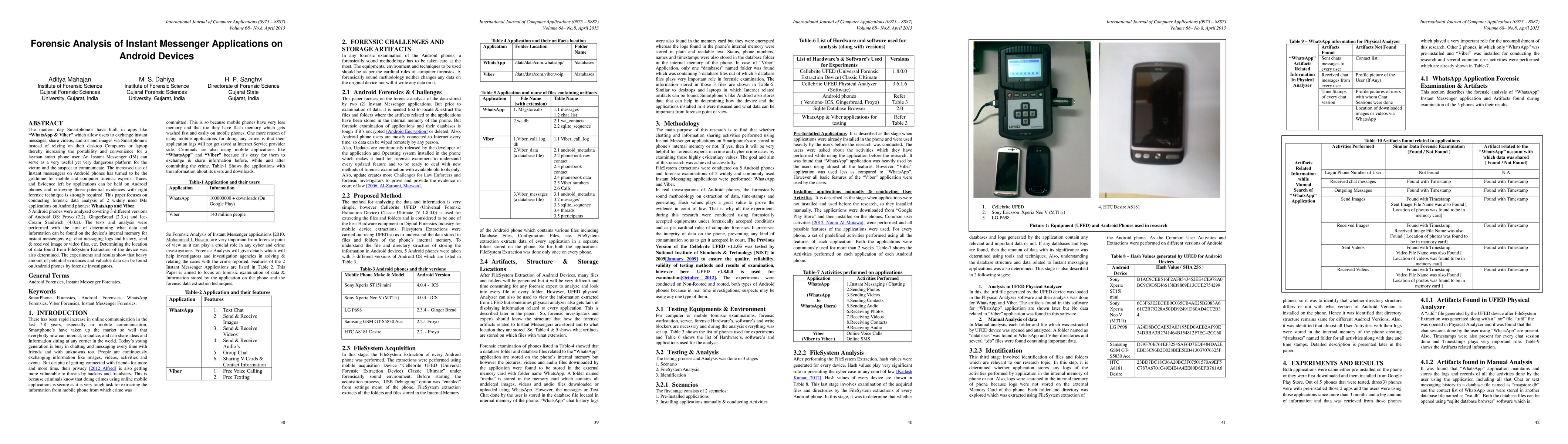 This paper focuses on conducting forensic data analysis of 2 widely used IMs applications on Android phones WhatsApp and Viber. The tests and analysis were performed with the aim of determining what data and information can be found on the devices internal memory for instant messengers eg chat messaging logs and history send & received image or video files etc. The experiments and results show that heavy amount of potential evidences and valuable data can be found on Android phones by forensic investigators.
