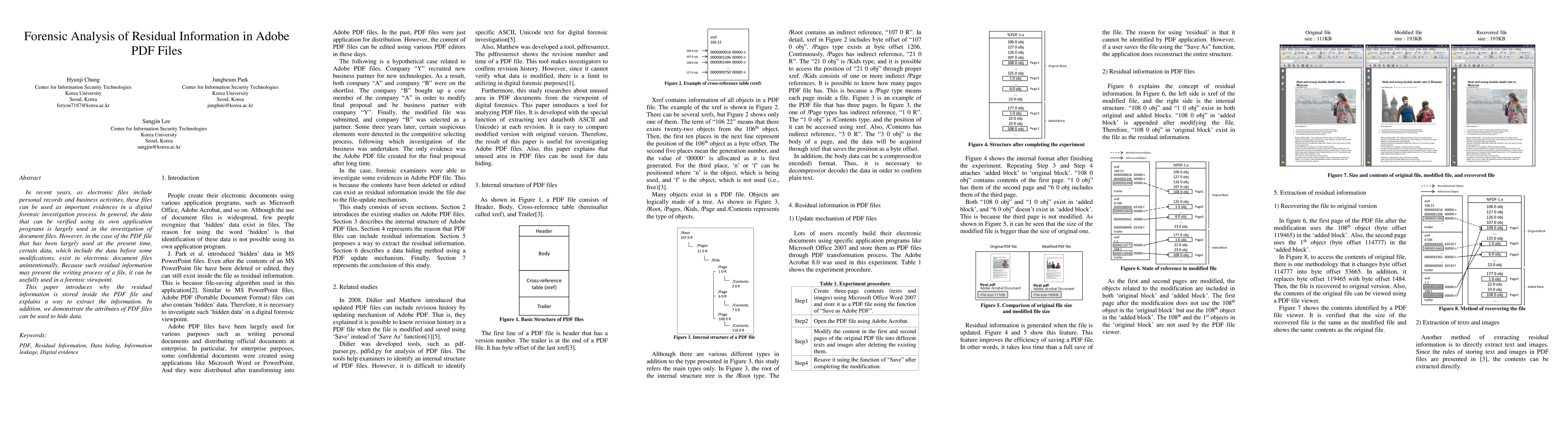 This work distinguishes itself by focusing on the forensic potential of residual information in Adobe PDF files, introducing a novel data hiding method using unused areas, and providing a practical tool, ExPRI, for digital forensic investigators.