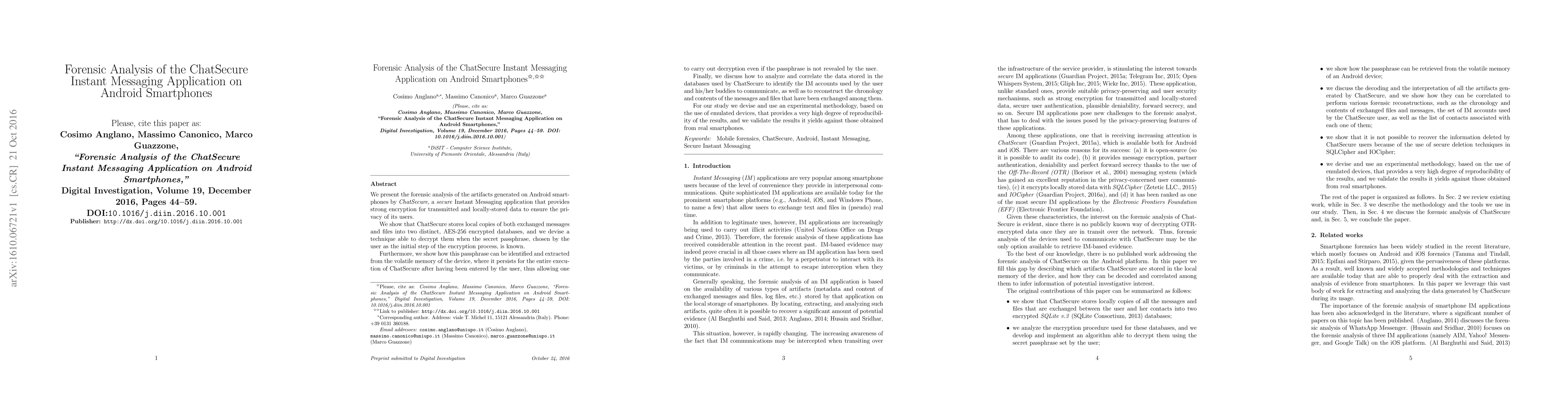 This paper presents a forensic analysis of ChatSecure's data storage on Android smartphones, revealing that it stores encrypted messages and files in two AES-256 encrypted databases. The authors demonstrate a technique to decrypt these databases using the user's passphrase, which can be extracted from the device's volatile memory, enabling decryption even if the passphrase is not disclosed.