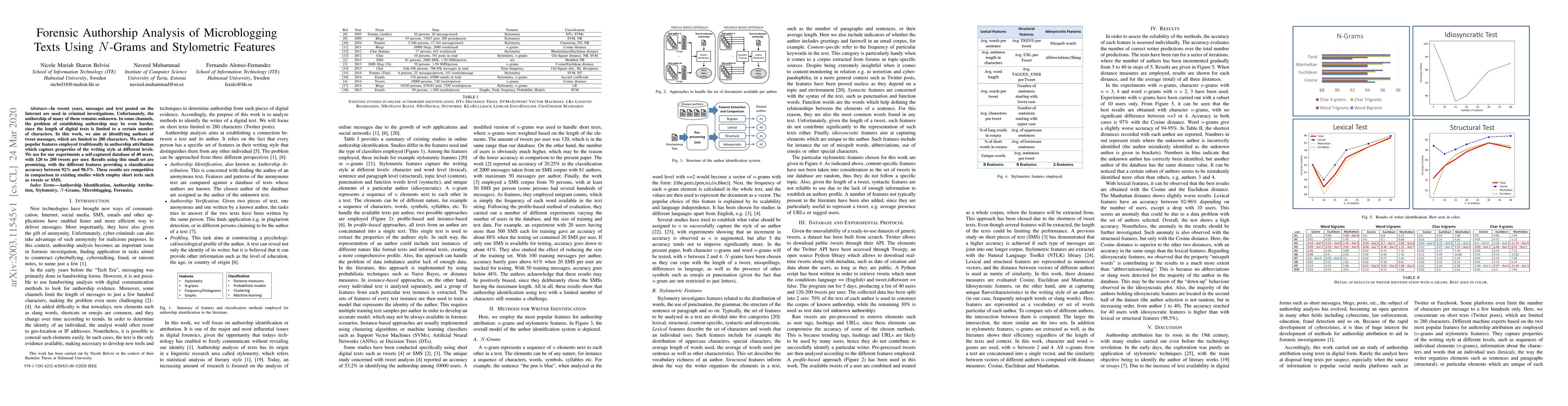 This paper explores forensic authorship analysis of Twitter messages using n-grams and stylometric features, achieving classification accuracy between 92% and 98.5% on a dataset of 40 users with 120 to 200 tweets each, demonstrating promising results for identifying short text authors.