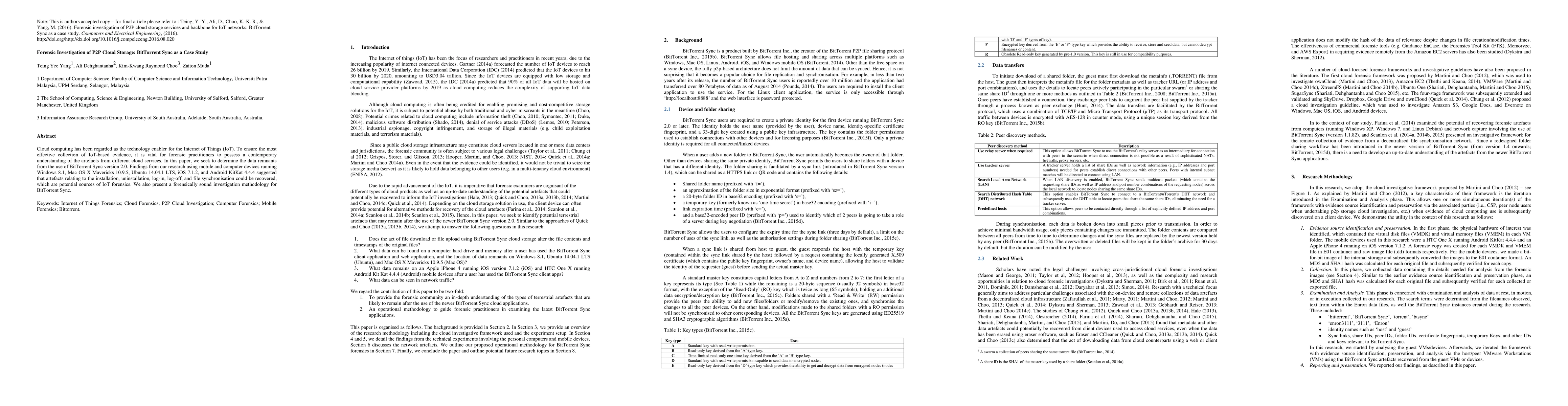 Researchers investigated data remnants from BitTorrent Sync cloud storage and found evidence of artefacts including installation logs, file synchronisation data, and user login information that can be recovered for forensic purposes. The study presents a forensically sound investigation methodology for recovering data from BitTorrent Sync.