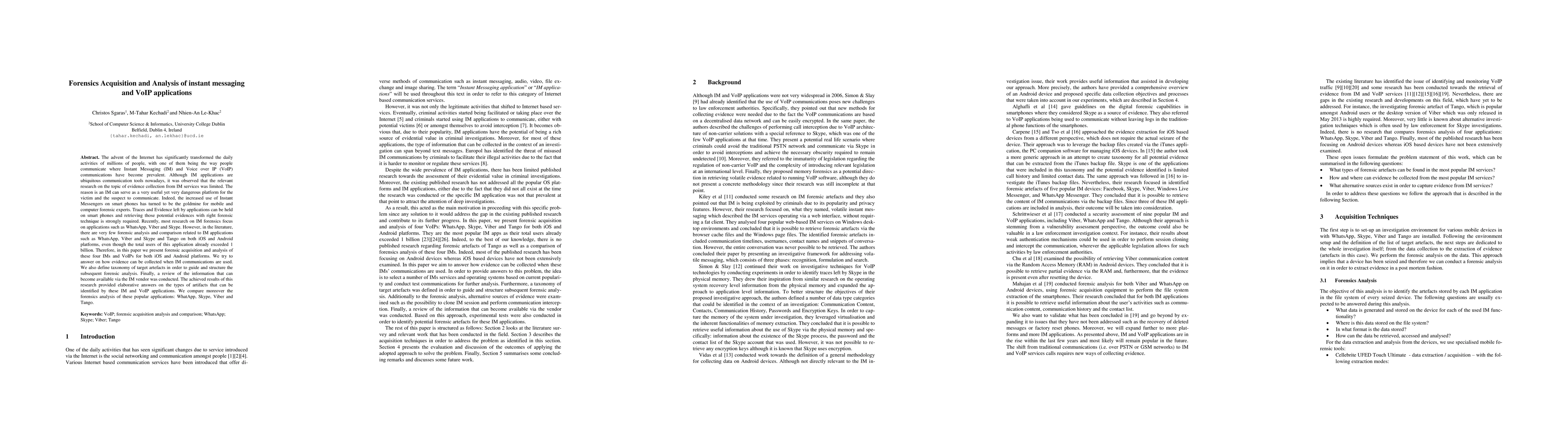 This paper investigates the forensic acquisition and analysis of popular Instant Messaging (IM) and Voice over IP (VoIP) applications, including WhatsApp, Viber, Skype, and Tango, on both iOS and Android platforms. It provides a detailed taxonomy of target artifacts and compares the forensic analysis methods for these applications, offering insights into the types of evidence that can be collected from IM communications.