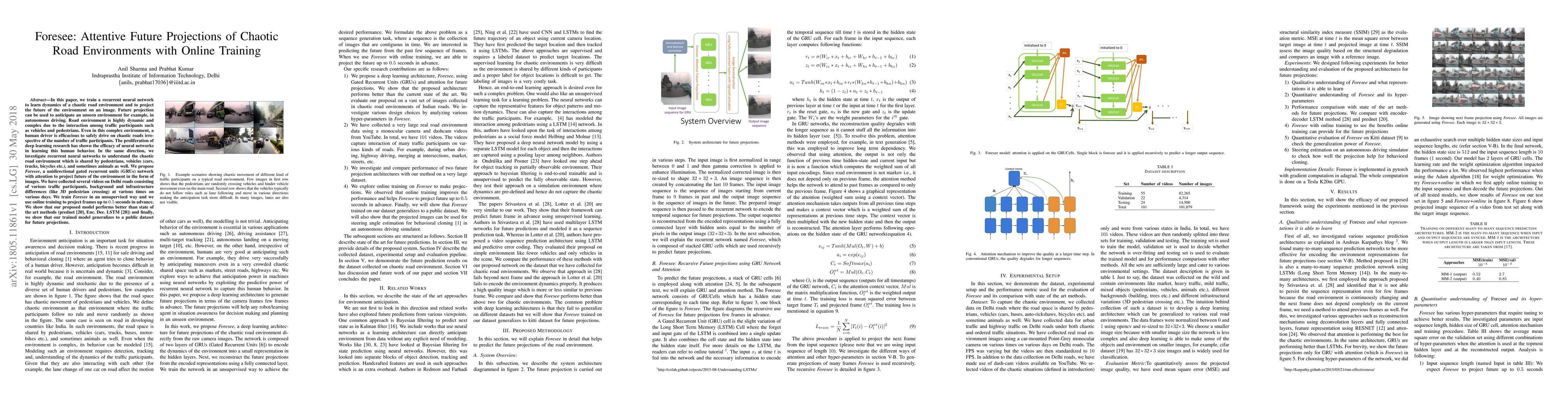 In this paper, we train a recurrent neural network to learn dynamics of a chaotic road environment and to project the future of the environment on an image. Future projection can be used to anticipate an unseen environment for example, in autonomous driving. Road environment is highly dynamic and complex due to the interaction among traffic participants such as vehicles and pedestrians. Even in this complex environment, a human driver is efficacious to safely drive on chaotic roads irrespective of the number of traffic participants. The proliferation of deep learning research has shown the efficacy of neural networks in learning this human behavior. In the same direction, we investigate recurrent neural networks to understand the chaotic road environment which is shared by pedestrians, vehicles (cars, trucks, bicycles etc.), and sometimes animals as well. We propose \emph{Foresee}, a unidirectional gated recurrent units (GRUs) network with attention to project future of the environment in the form of images. We have collected several videos on Delhi roads consisting of various traffic participants, background and infrastructure differences (like 3D pedestrian crossing) at various times on various days. We train \emph{Foresee} in an unsupervised way and we use online training to project frames up to $0.5$ seconds in advance. We show that our proposed model performs better than state of the art methods (prednet and Enc. Dec. LSTM) and finally, we show that our trained model generalizes to a public dataset for future projections.
