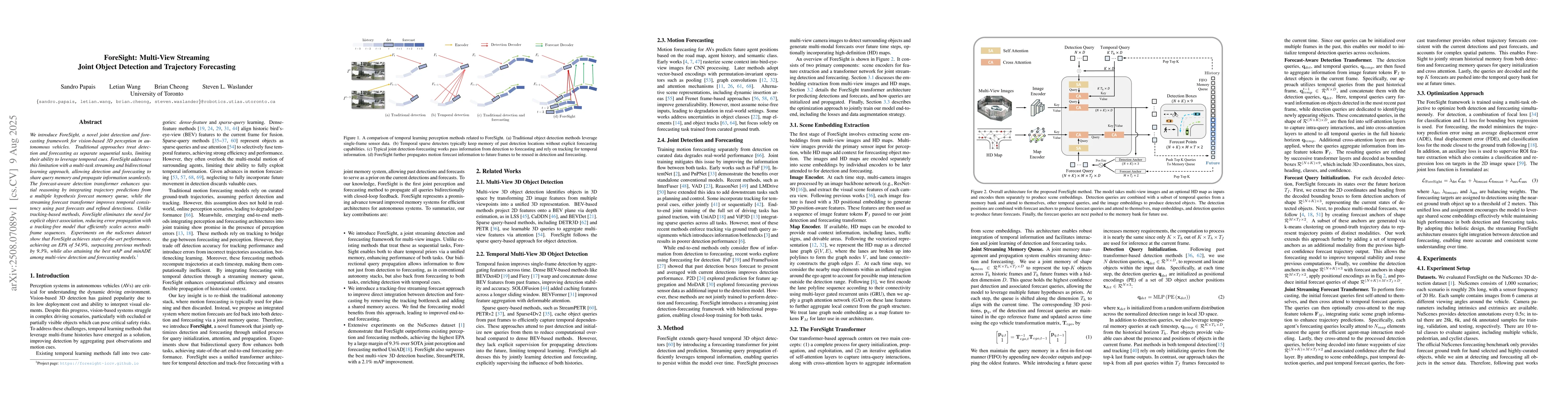 ForeSight introduces a joint detection and forecasting framework for 3D perception in autonomous vehicles using a multi-task streaming and bidirectional learning approach, enhancing spatial and temporal reasoning through query memory sharing between detection and forecasting tasks.