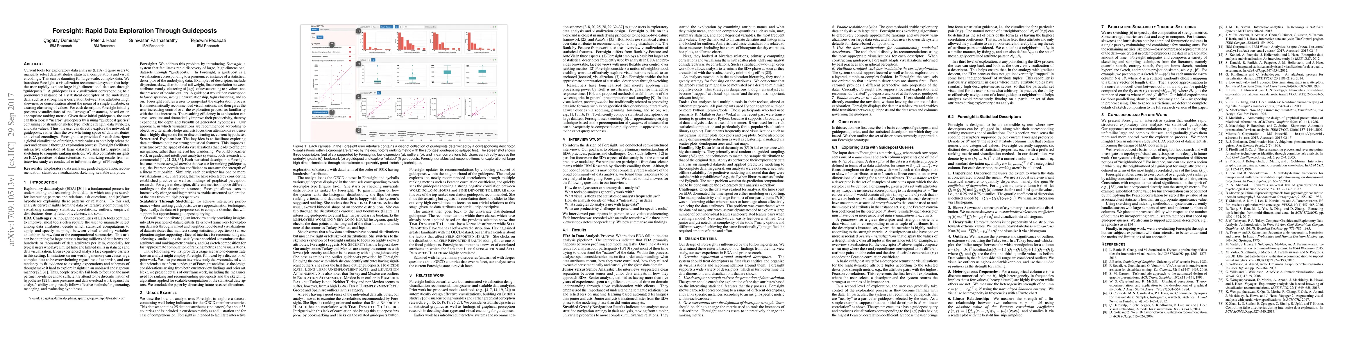 Foresight is a visualization recommender system that assists users in rapidly exploring large, complex datasets by presenting "guideposts" highlighting significant statistical features, thus simplifying the overwhelming task of manual data selection. It enables users to explore a network of guideposts through queries, supplemented by global visualizations to ensure thorough exploration.