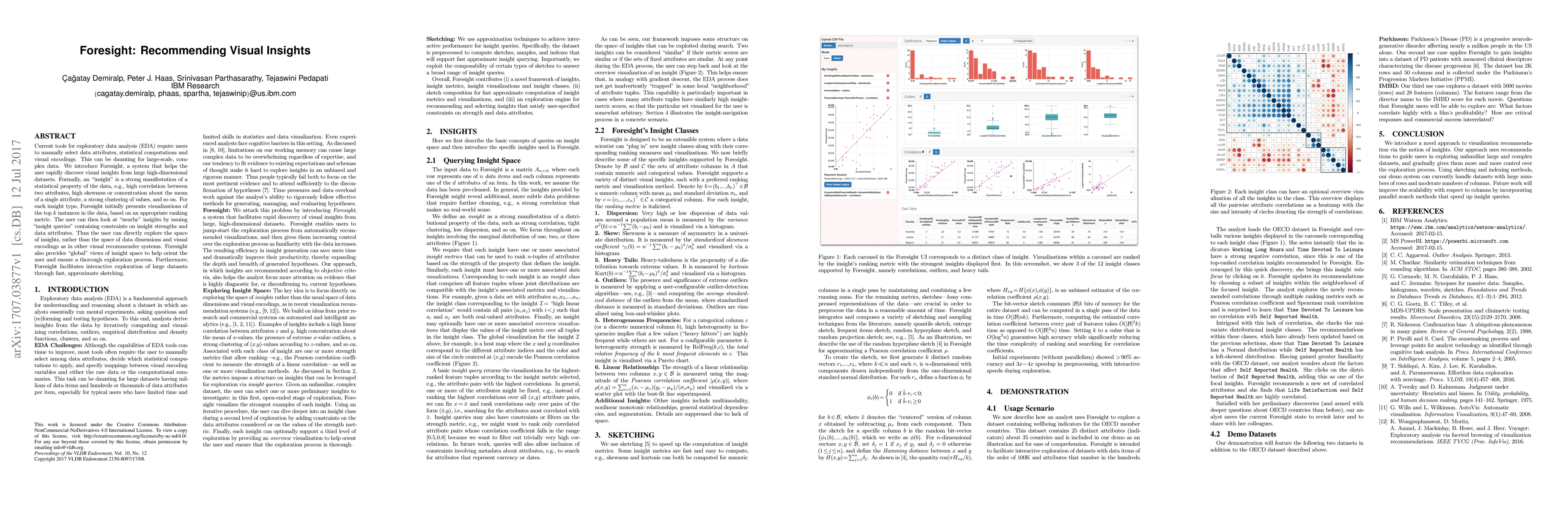 Foresight is a system designed to assist users in rapidly discovering visual insights from large, high-dimensional datasets by automatically identifying and presenting strong statistical properties. It enables users to explore the space of insights through interactive queries and global views, rather than navigating data dimensions and visual encodings.