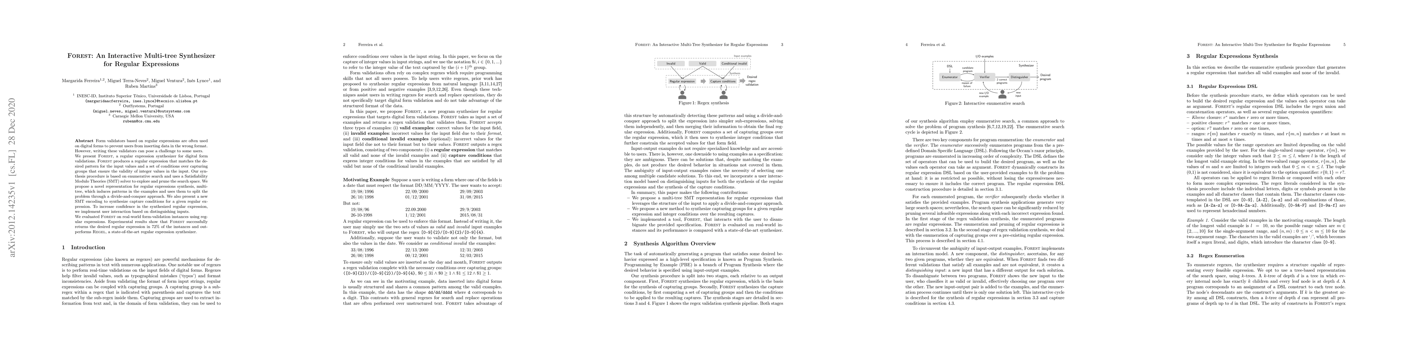 Form validators based on regular expressions are often used on digital forms to prevent users from inserting data in the wrong format. However, writing these validators can pose a challenge to some users. We present FOREST, a regular expression synthesizer for digital form validations. FOREST produces a regular expression that matches the desired pattern for the input values and a set of conditions over capturing groups that ensure the validity of integer values in the input. Our synthesis procedure is based on enumerative search and uses a Satisfiability Modulo Theories (SMT) solver to explore and prune the search space. We propose a novel representation for regular expressions synthesis, multi-tree, which induces patterns in the examples and uses them to split the problem through a divide-and-conquer approach. We also present a new SMT encoding to synthesize capture conditions for a given regular expression. To increase confidence in the synthesized regular expression, we implement user interaction based on distinguishing inputs. We evaluated FOREST on real-world form-validation instances using regular expressions. Experimental results show that FOREST successfully returns the desired regular expression in 72% of the instances and outperforms REGEL, a state-of-the-art regular expression synthesizer.
