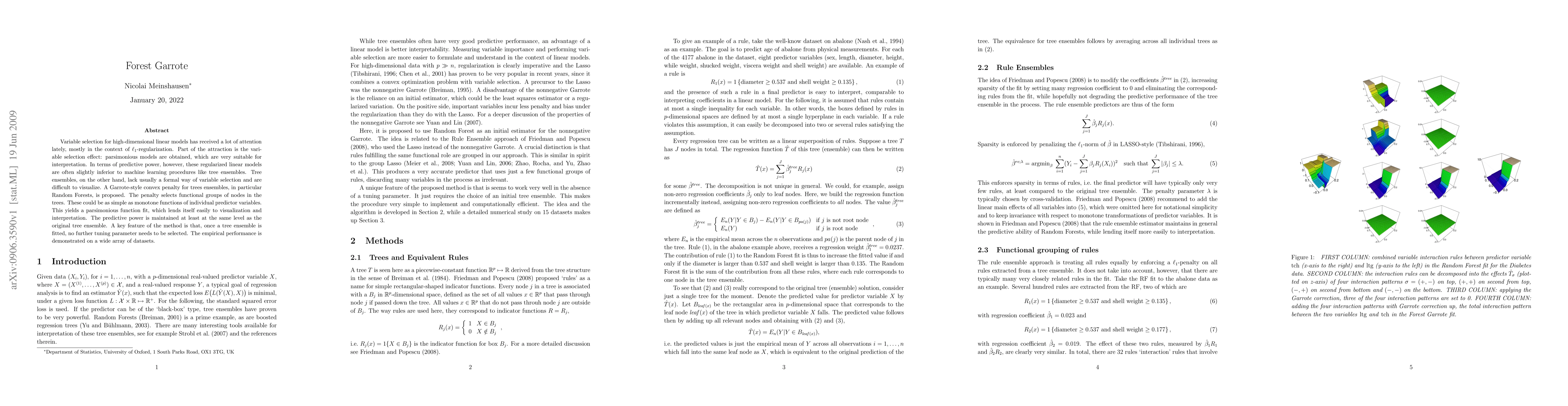 Variable selection for high-dimensional linear models has received a lot of attention lately, mostly in the context of l1-regularization. Part of the attraction is the variable selection effect: parsimonious models are obtained, which are very suitable for interpretation. In terms of predictive power, however, these regularized linear models are often slightly inferior to machine learning procedures like tree ensembles. Tree ensembles, on the other hand, lack usually a formal way of variable selection and are difficult to visualize. A Garrote-style convex penalty for trees ensembles, in particular Random Forests, is proposed. The penalty selects functional groups of nodes in the trees. These could be as simple as monotone functions of individual predictor variables. This yields a parsimonious function fit, which lends itself easily to visualization and interpretation. The predictive power is maintained at least at the same level as the original tree ensemble. A key feature of the method is that, once a tree ensemble is fitted, no further tuning parameter needs to be selected. The empirical performance is demonstrated on a wide array of datasets.