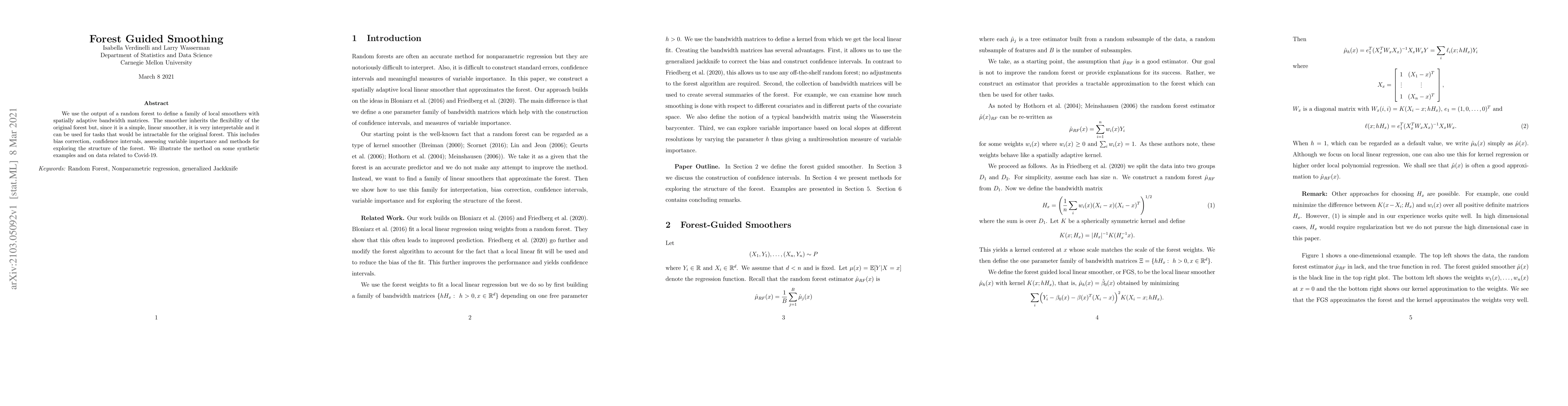 We use the output of a random forest to define a family of local smoothers with spatially adaptive bandwidth matrices. The smoother inherits the flexibility of the original forest but, since it is a simple, linear smoother, it is very interpretable and it can be used for tasks that would be intractable for the original forest. This includes bias correction, confidence intervals, assessing variable importance and methods for exploring the structure of the forest. We illustrate the method on some synthetic examples and on data related to Covid-19.