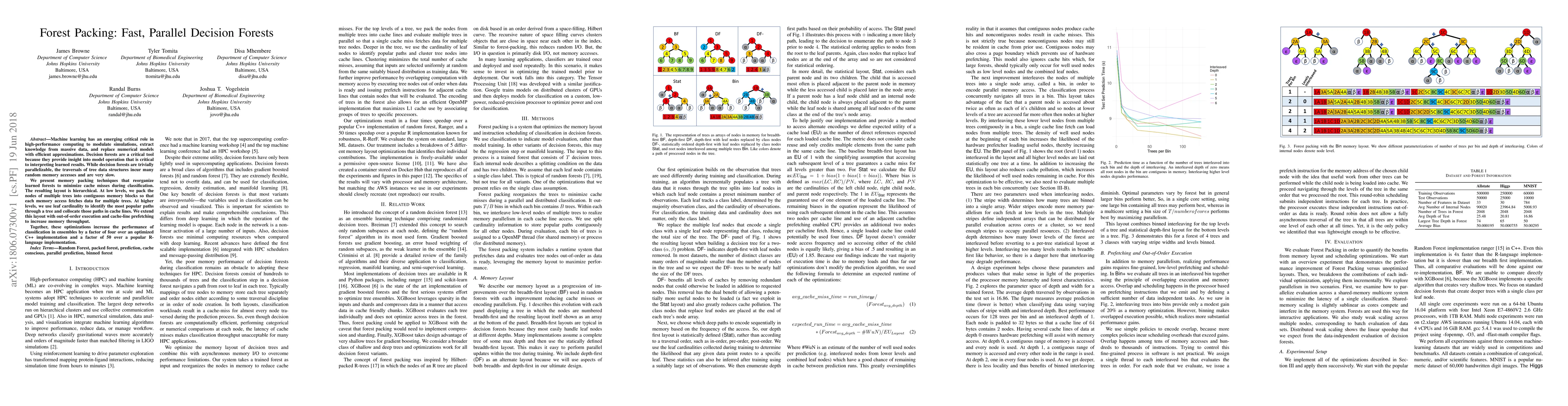Machine learning has an emerging critical role in high-performance computing to modulate simulations, extract knowledge from massive data, and replace numerical models with efficient approximations. Decision forests are a critical tool because they provide insight into model operation that is critical to interpreting learned results. While decision forests are trivially parallelizable, the traversals of tree data structures incur many random memory accesses and are very slow. We present memory packing techniques that reorganize learned forests to minimize cache misses during classification. The resulting layout is hierarchical. At low levels, we pack the nodes of multiple trees into contiguous memory blocks so that each memory access fetches data for multiple trees. At higher levels, we use leaf cardinality to identify the most popular paths through a tree and collocate those paths in cache lines. We extend this layout with out-of-order execution and cache-line prefetching to increase memory throughput. Together, these optimizations increase the performance of classification in ensembles by a factor of four over an optimized C++ implementation and a actor of 50 over a popular R language implementation.