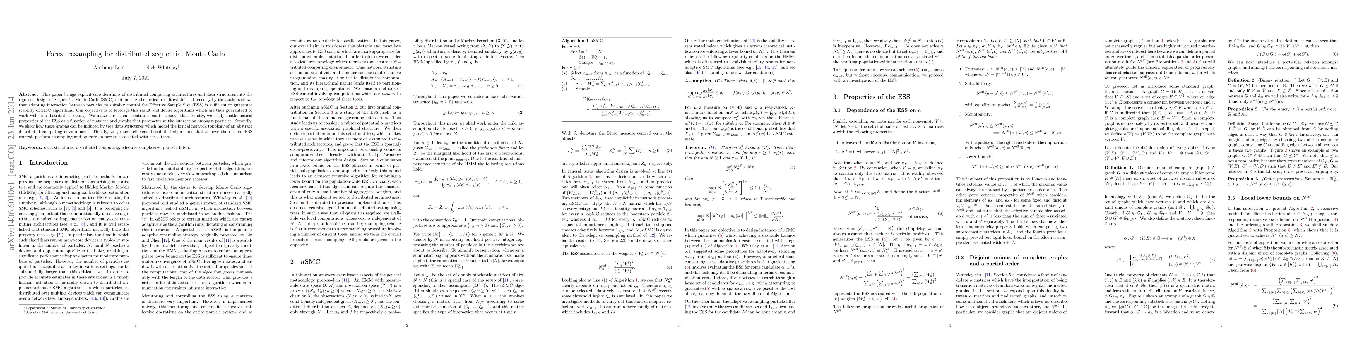 This paper develops distributed Sequential Monte Carlo (SMC) algorithms by controlling the Effective Sample Size (ESS) through particle interaction matrices and graph structures. It presents efficient distributed algorithms leveraging forest resampling to maintain stability and performance in distributed computing environments.