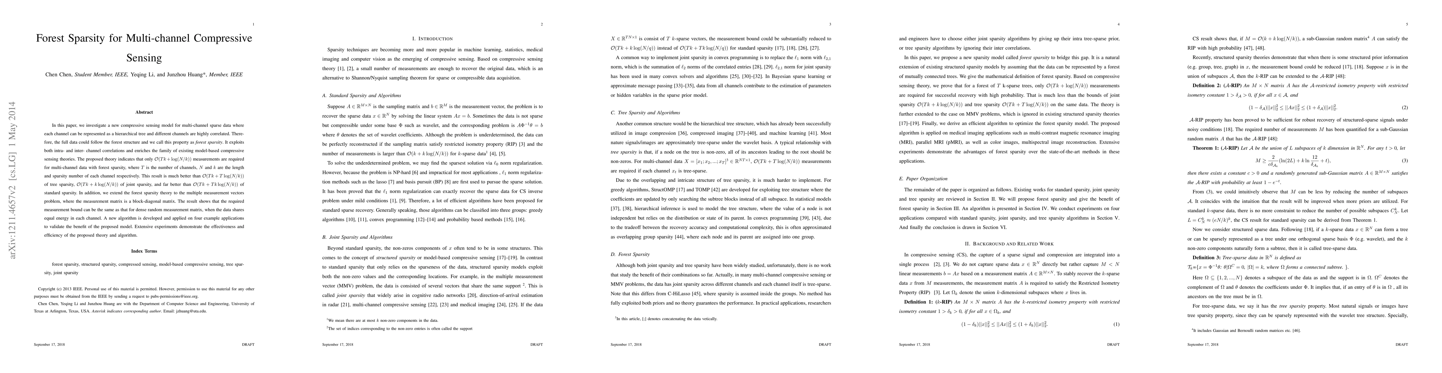 This paper proposes a novel compressive sensing model called forest sparsity for multi-channel sparse data, exploiting both intra- and inter-channel correlations. It requires significantly fewer measurements than existing models, demonstrating improved efficiency and effectiveness through experiments and applications.