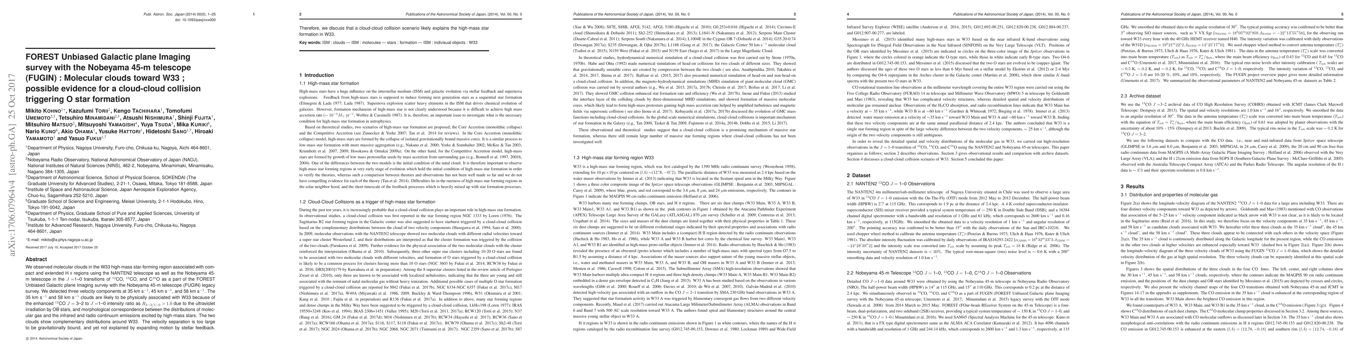 The FUGIN survey detected molecular clouds in the W33 star-forming region, revealing three distinct velocity components. Evidence suggests a cloud-cloud collision may trigger high-mass star formation in W33, as indicated by the distribution and interaction of the clouds.