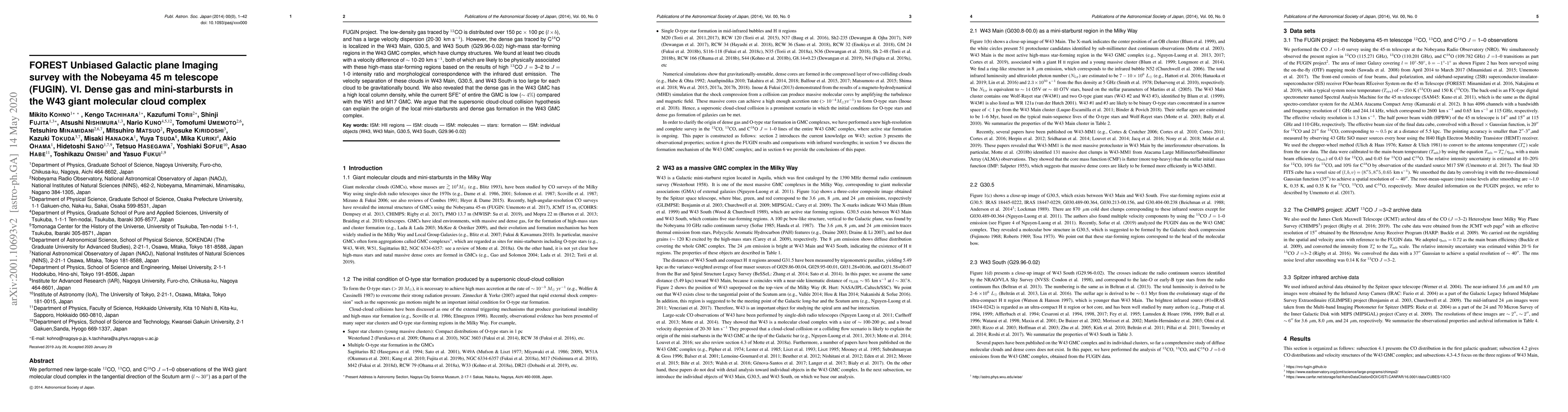 We performed new large-scale $^{12}$CO, $^{13}$CO, and C$^{18}$O $J=$1--0 observations of the W43 giant molecular cloud complex in the tangential direction of the Scutum arm ($l\sim {30^\circ}$) as a part of the FUGIN project. The low-density gas traced by $^{12}$CO is distributed over 150 pc $\times$ 100 pc ($l \times b$), and has a large velocity dispersion (20-30 km s$^{-1}$). However, the dense gas traced by C$^{18}$O is localized in the W43 Main, G30.5, and W43 South (G29.96-0.02) high-mass star-forming regions in the W43 GMC complex, which have clumpy structures. We found at least two clouds with a velocity difference of $\sim$ 10-20 km s$^{-1}$, both of which are likely to be physically associated with these high-mass star-forming regions based on the results of high $^{13}$CO $J=$ 3-2 to $J =$ 1-0 intensity ratio and morphological correspondence with the infrared dust emission. The velocity separation of these clouds in W43 Main, G30.5, and W43 South is too large for each cloud to be gravitationally bound. We also revealed that the dense gas in the W43 GMC has a high local column density, while "the current SFE" of entire the GMC is low ($\sim 4\%$) compared with the W51 and M17 GMC. We argue that the supersonic cloud-cloud collision hypothesis can explain the origin of the local mini-starbursts and dense gas formation in the W43 GMC complex.