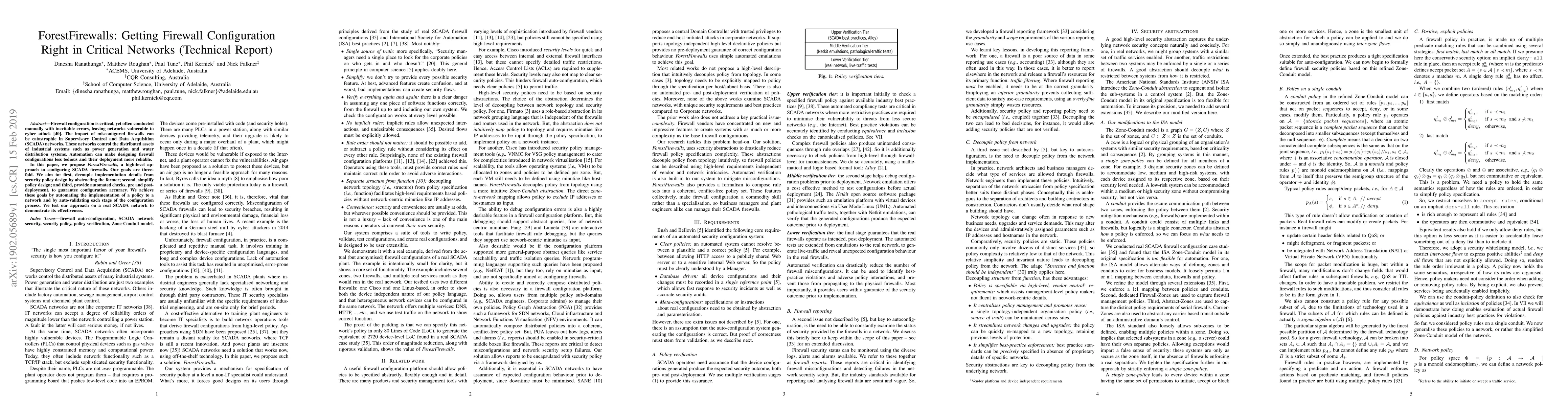 This paper proposes ForestFirewalls, an automated method to configure firewalls in SCADA networks, aiming to decouple implementation details from policy design, simplify policy creation, and ensure configuration accuracy through automated checks. The approach was tested on a real SCADA network, demonstrating its effectiveness.