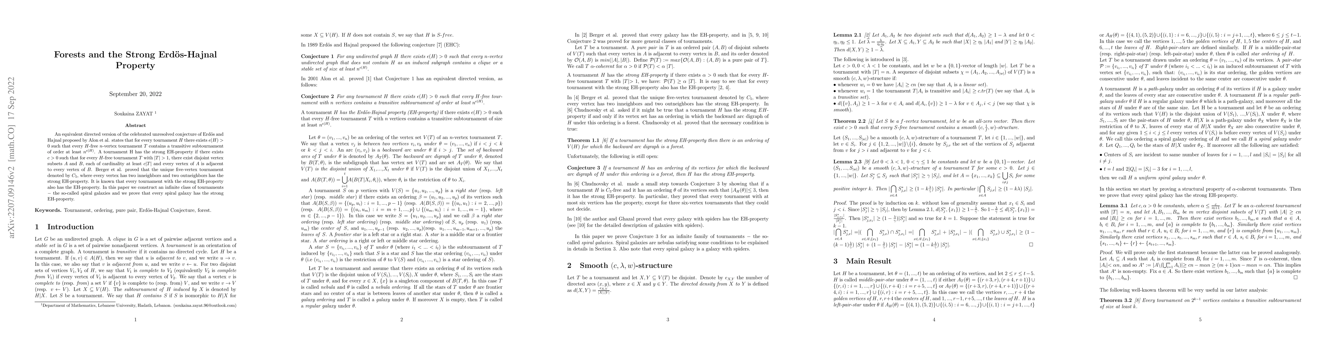 This paper investigates an equivalent directed version of the Erdos-Hajnal conjecture, proving that an infinite class of tournaments called spiral galaxies possesses the strong Erdos-Hajnal property, which implies a robust structural characteristic in tournament theory.